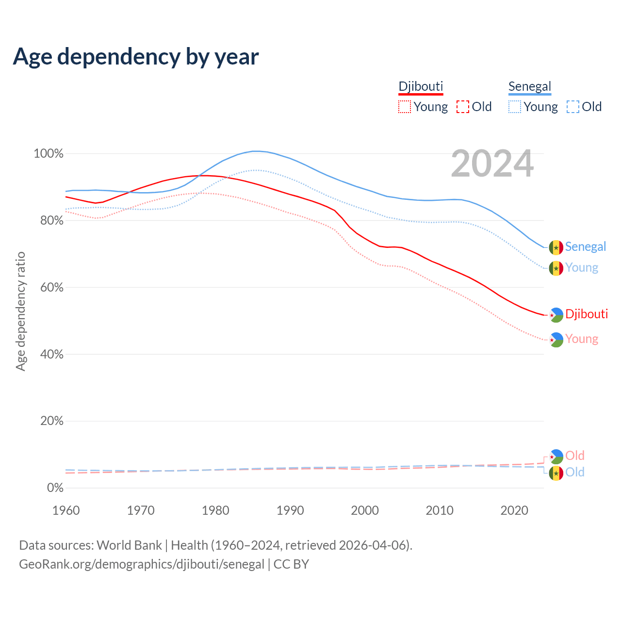 - The share of old-age demographic (65+) in Djibouti is 4.85% vs 3.62% in Senegal.