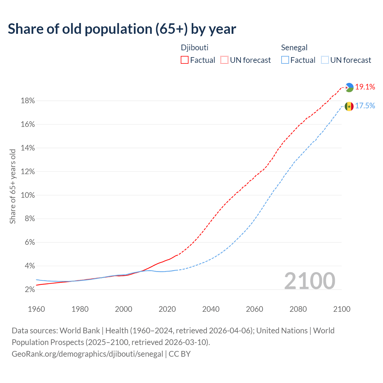 The share of older people aged 65 and over is 4.85% in Djibouti and 3.62% in Senegal. Life expectancy in Djibouti compared to Senegal .