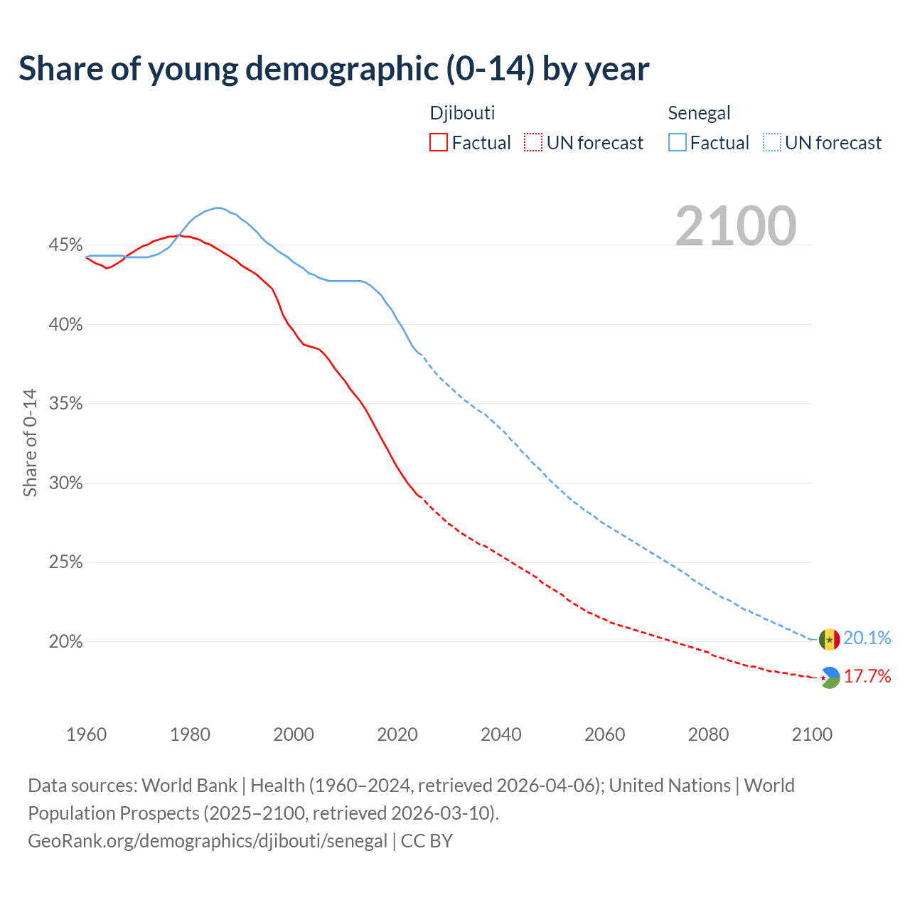 Median age Djibouti vs Senegal, 1960-2100