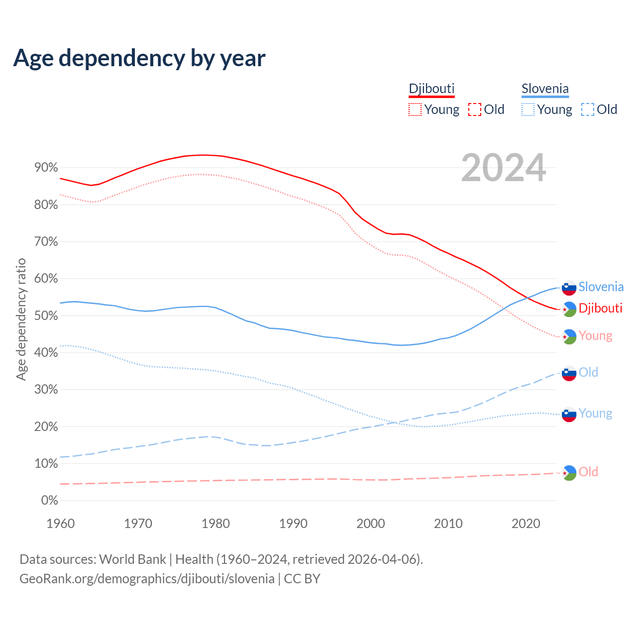 - The share of old-age demographic (65+) in Djibouti is 4.85% vs 21.8% in Slovenia.