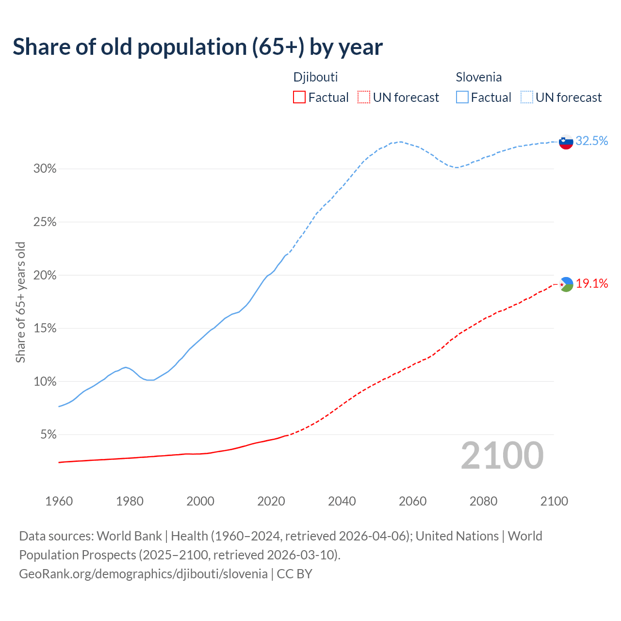 The share of older people aged 65 and over is 4.85% in Djibouti and 21.8% in Slovenia. Life expectancy in Djibouti compared to Slovenia .