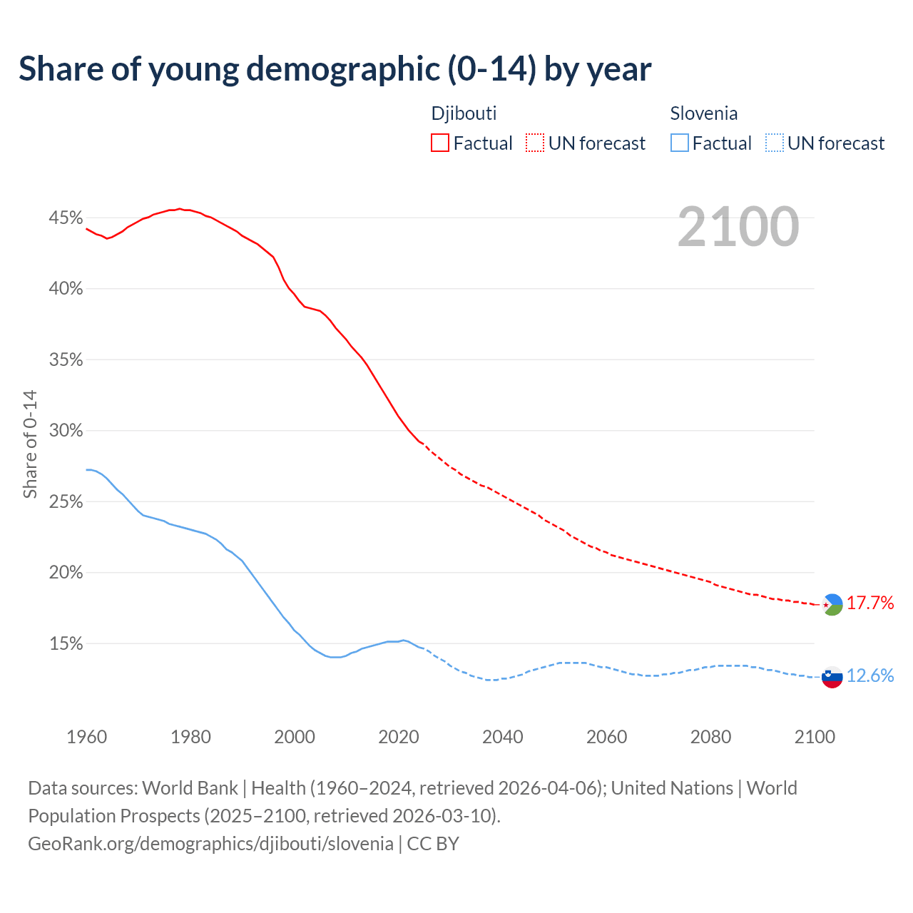 - The share of young demographic (0-15 years old) in Djibouti is 29.2% vs 14.7% in Slovenia.