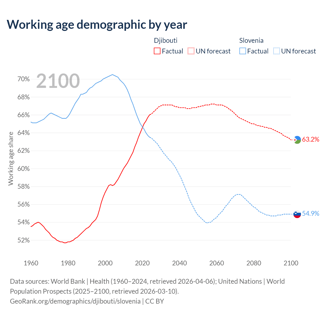 Median age Djibouti vs Slovenia, 1960-2100