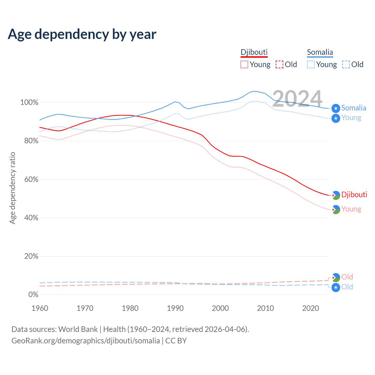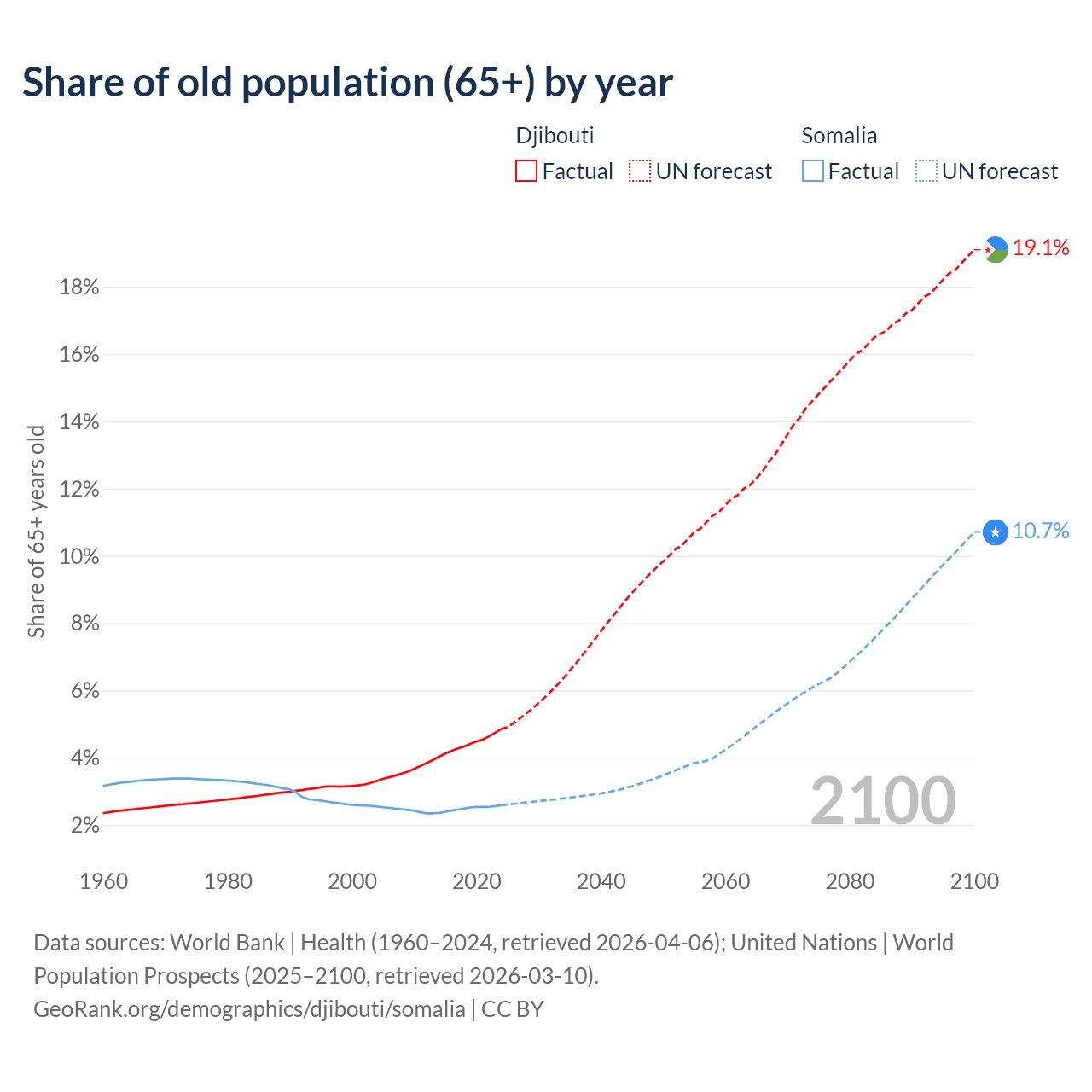 - The share of old-age demographic (65+) in Djibouti is 4.85% vs 2.59% in Somalia.