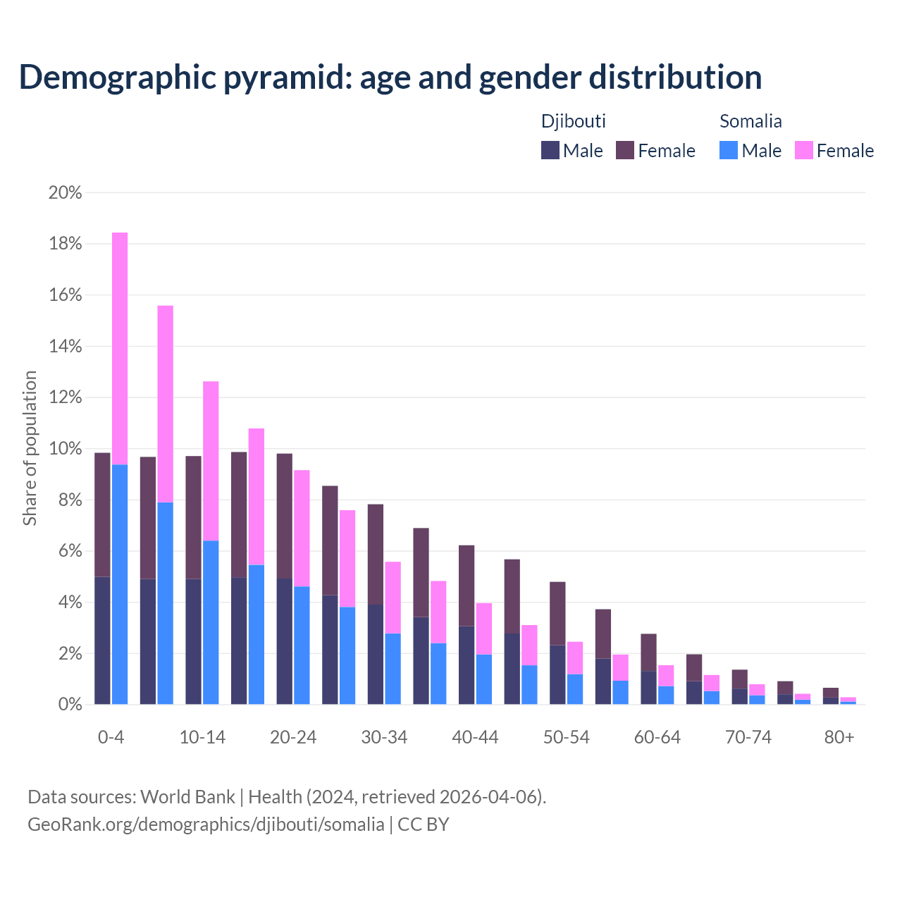 - Djibouti is ranked 129/196 by median age (oldest to youngest) vs 194/196 for Somalia.