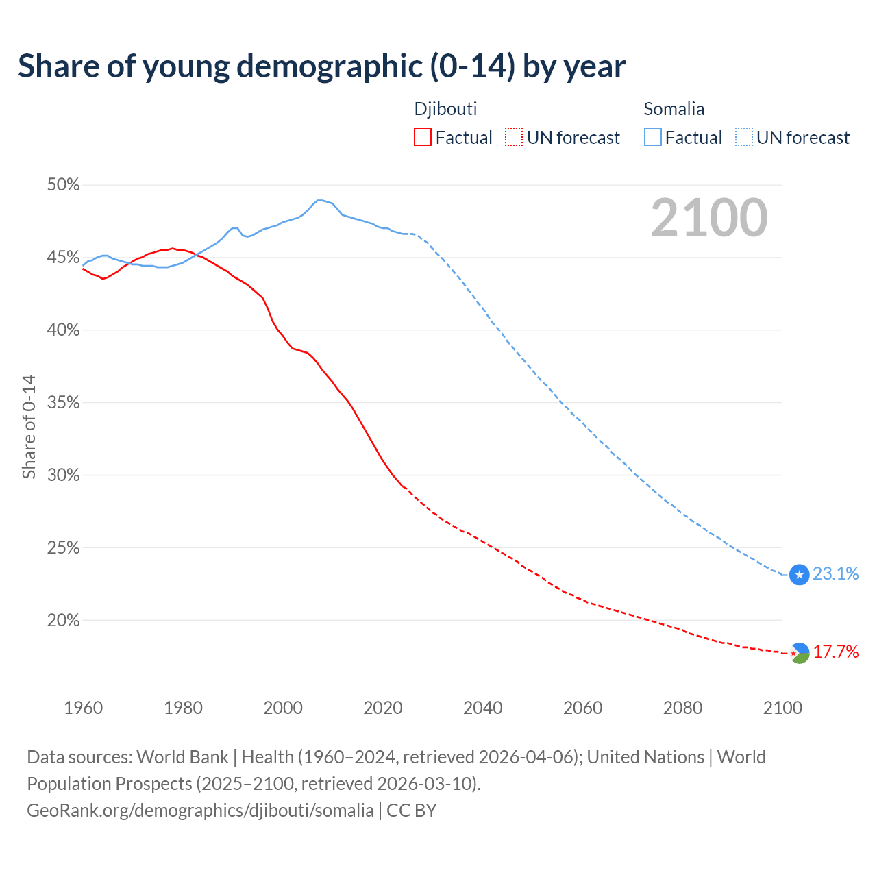 - The share of young demographic (0-15 years old) in Djibouti is 29.2% vs 46.6% in Somalia.