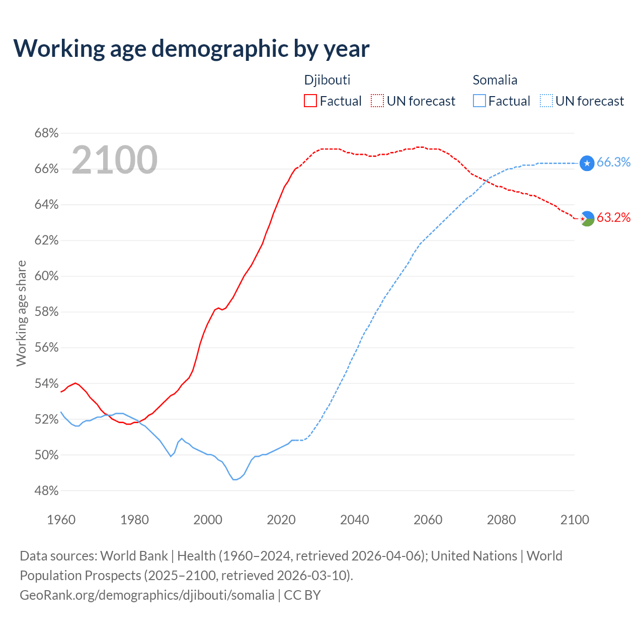 - Djibouti has 794K working age adults (aged 15-64) vs 10.4M in Somalia.