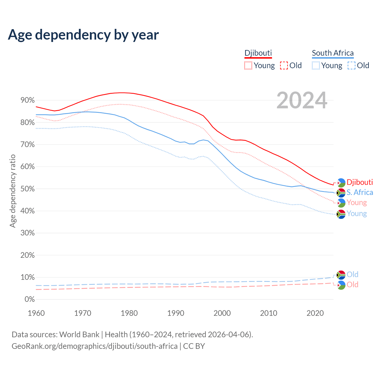 - Djibouti is ranked 129/196 by median age (oldest to youngest) vs 107/196 for South Africa.