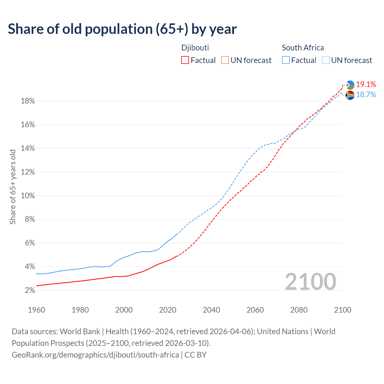 The share of older people aged 65 and over is 4.85% in Djibouti and 6.69% in South Africa. Life expectancy in Djibouti compared to South Africa .