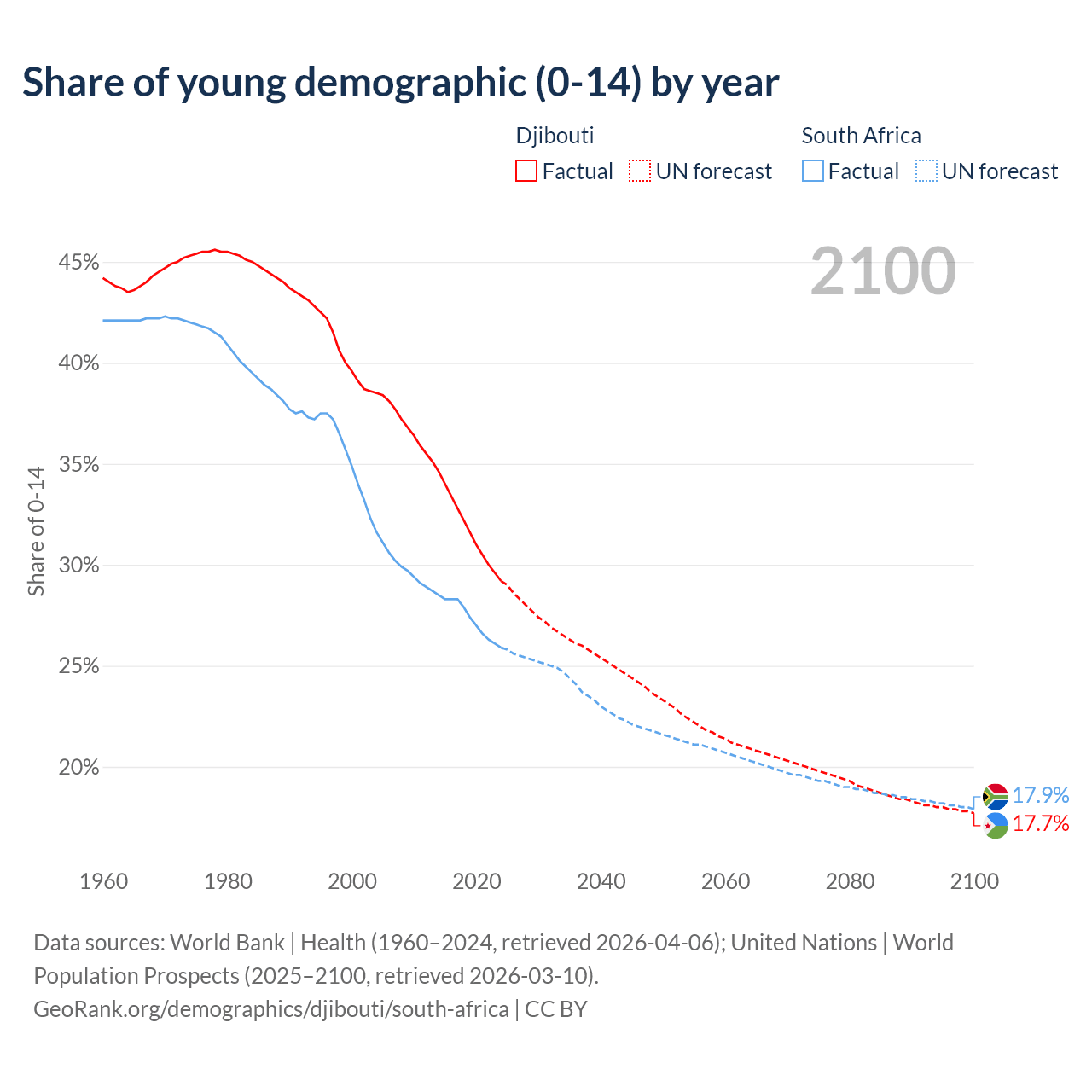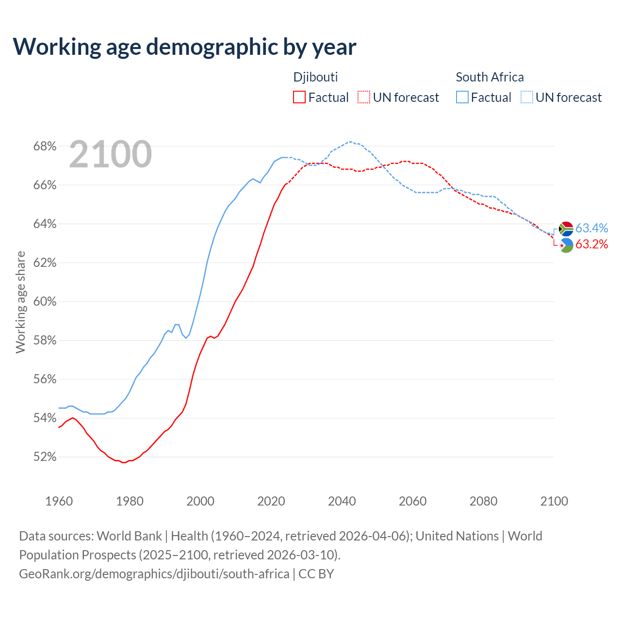 Median age Djibouti vs South Africa, 1960-2100