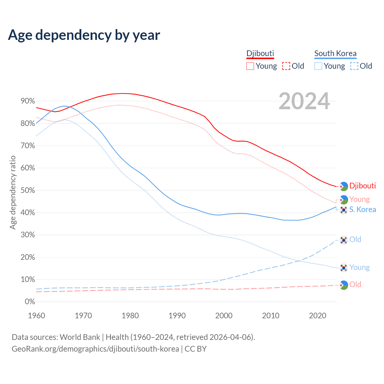 - Djibouti is ranked 129/196 by median age (oldest to youngest) vs 10/196 for South Korea.