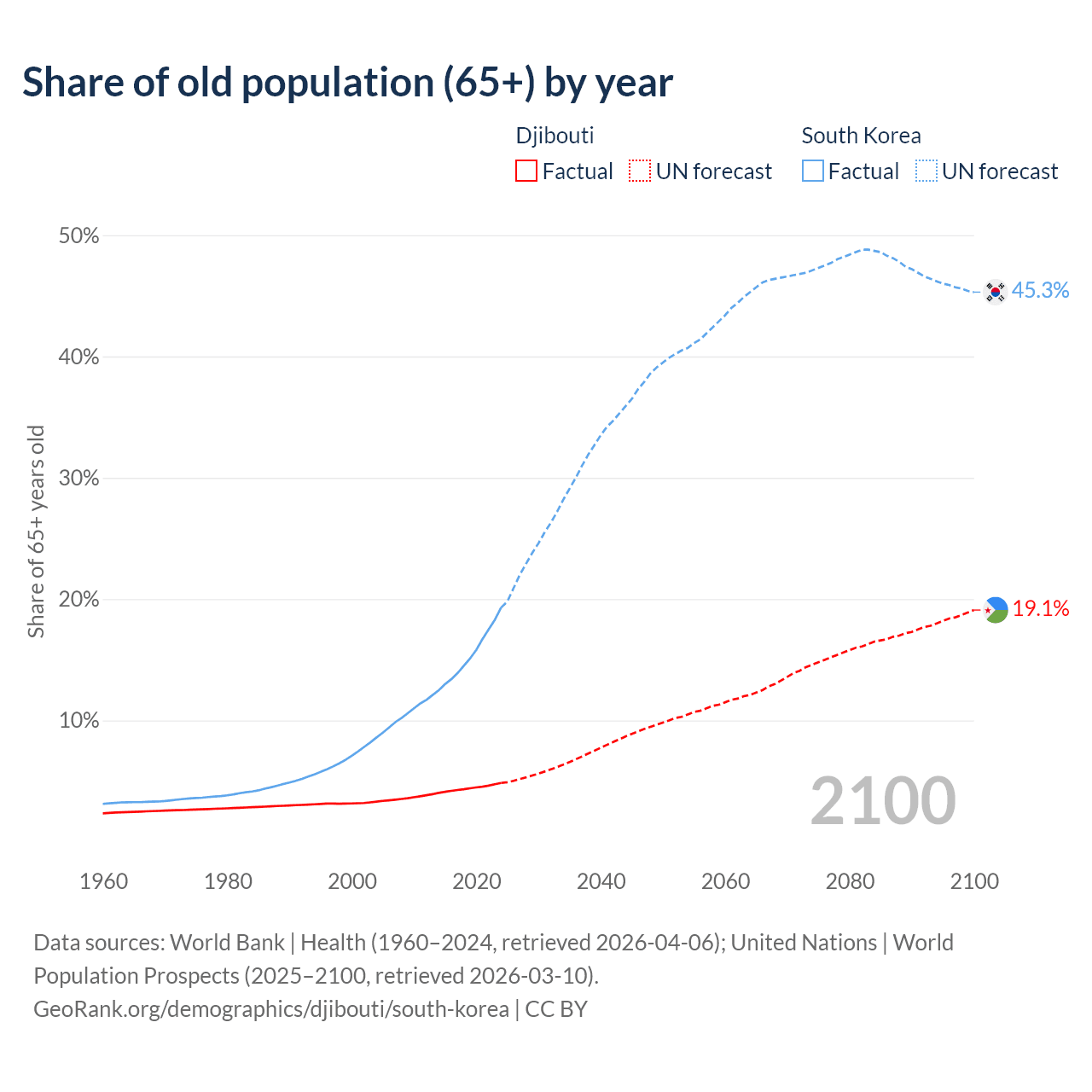 The share of older people aged 65 and over is 4.85% in Djibouti and 19.3% in South Korea. Life expectancy in Djibouti compared to South Korea .