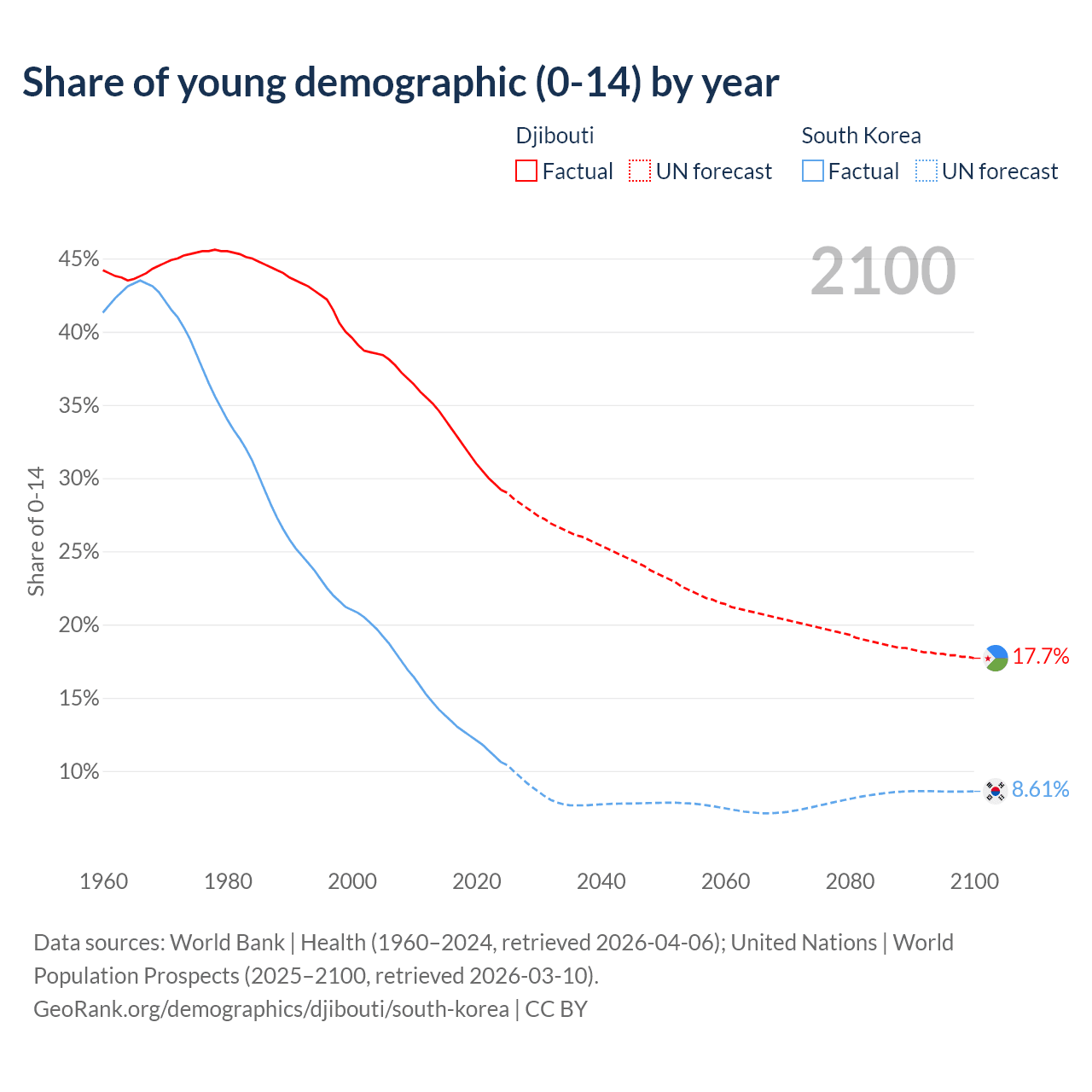 - The share of young demographic (0-15 years old) in Djibouti is 29.2% vs 10.6% in South Korea.
