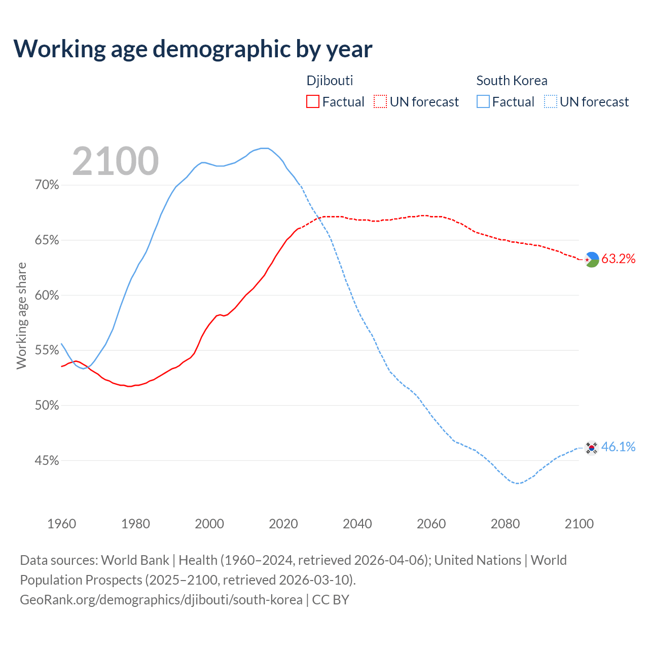 - Djibouti has 794K working age adults (aged 15-64) vs 36.2M in South Korea.