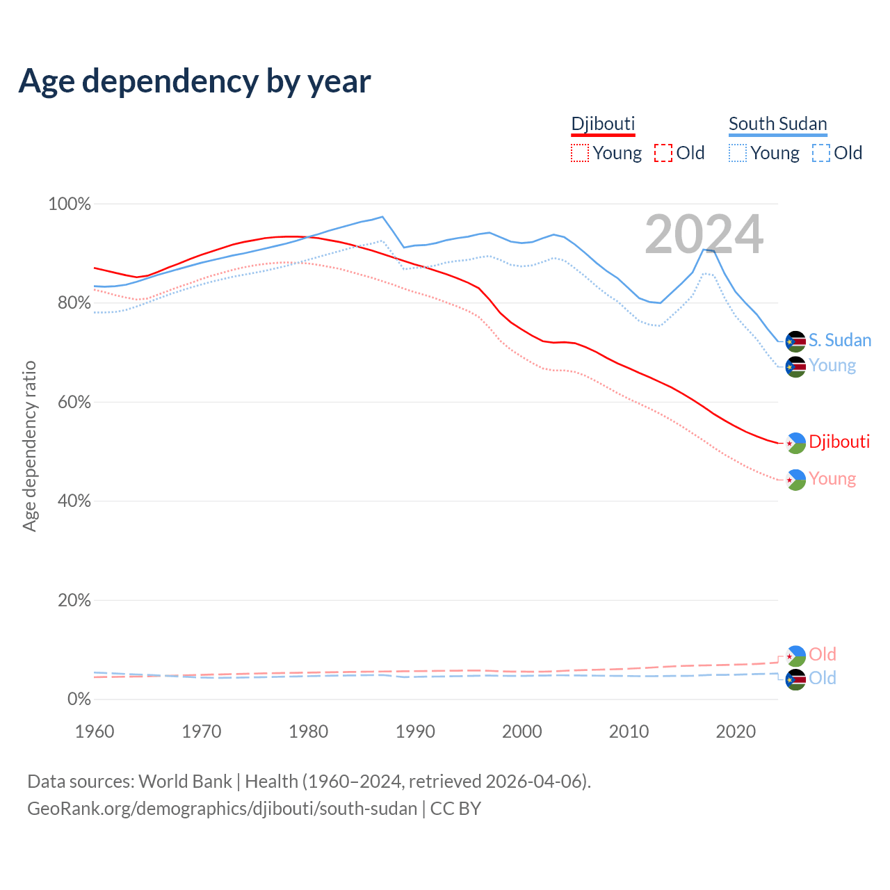 - Djibouti is ranked 129/196 by median age (oldest to youngest) vs 173/196 for South Sudan.