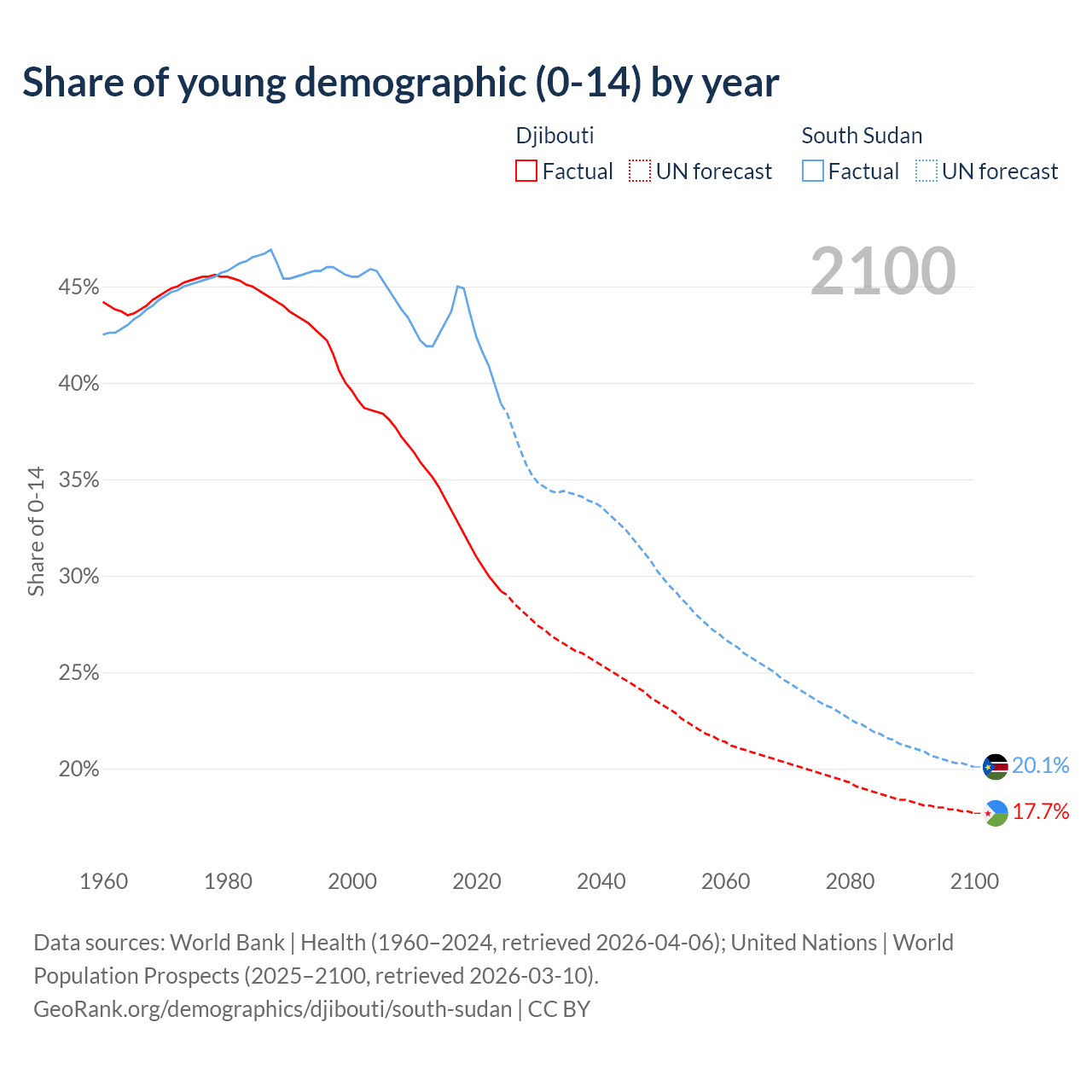 - The share of young demographic (0-15 years old) in Djibouti is 29.2% vs 38.9% in South Sudan.