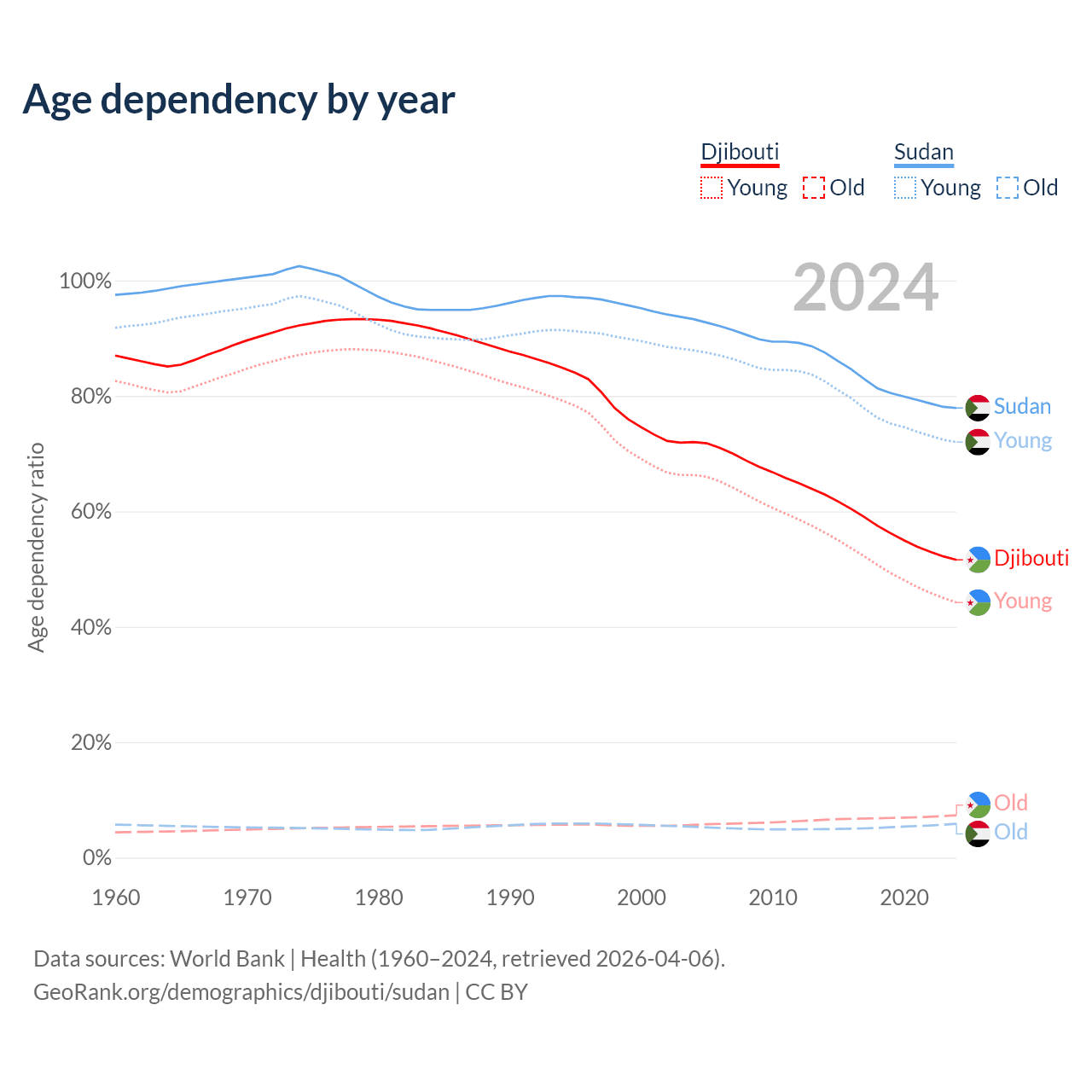 - Djibouti is ranked 129/196 by median age (oldest to youngest) vs 172/196 for Sudan.