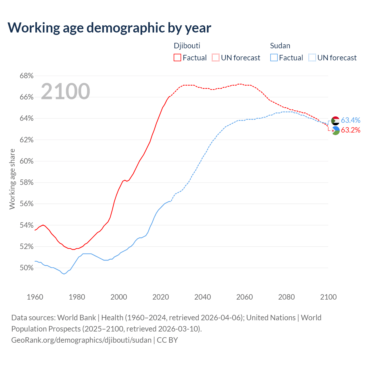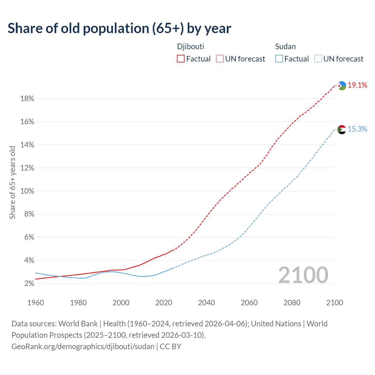 - The share of old-age demographic (65+) in Djibouti is 4.85% vs 3.3% in Sudan.