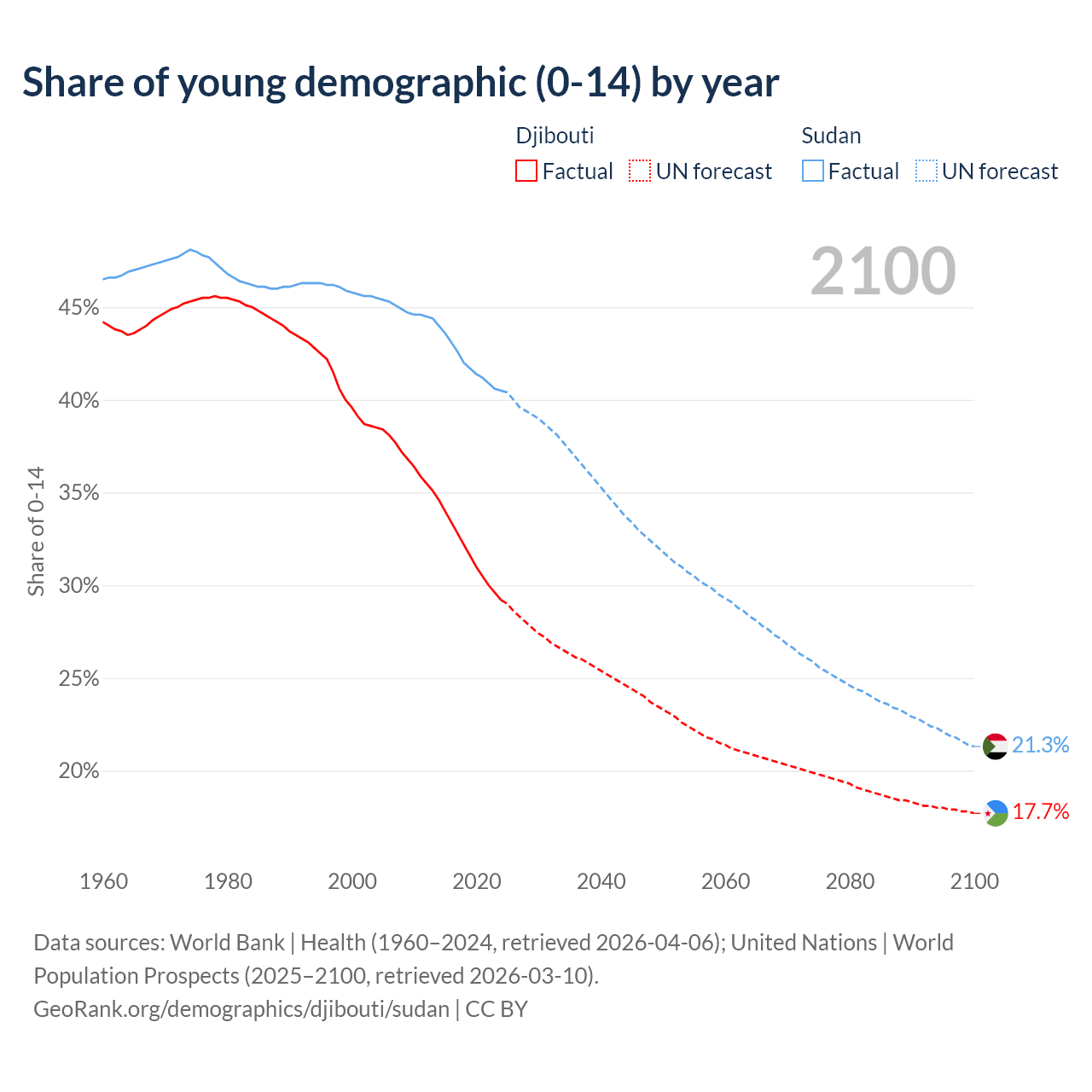 Median age Djibouti vs Sudan, 1960-2100