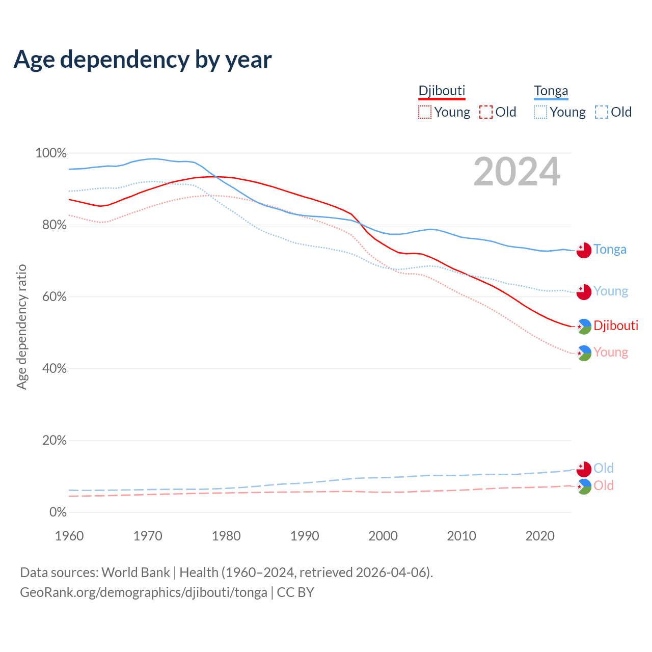 - The share of old-age demographic (65+) in Djibouti is 4.85% vs 6.72% in Tonga.