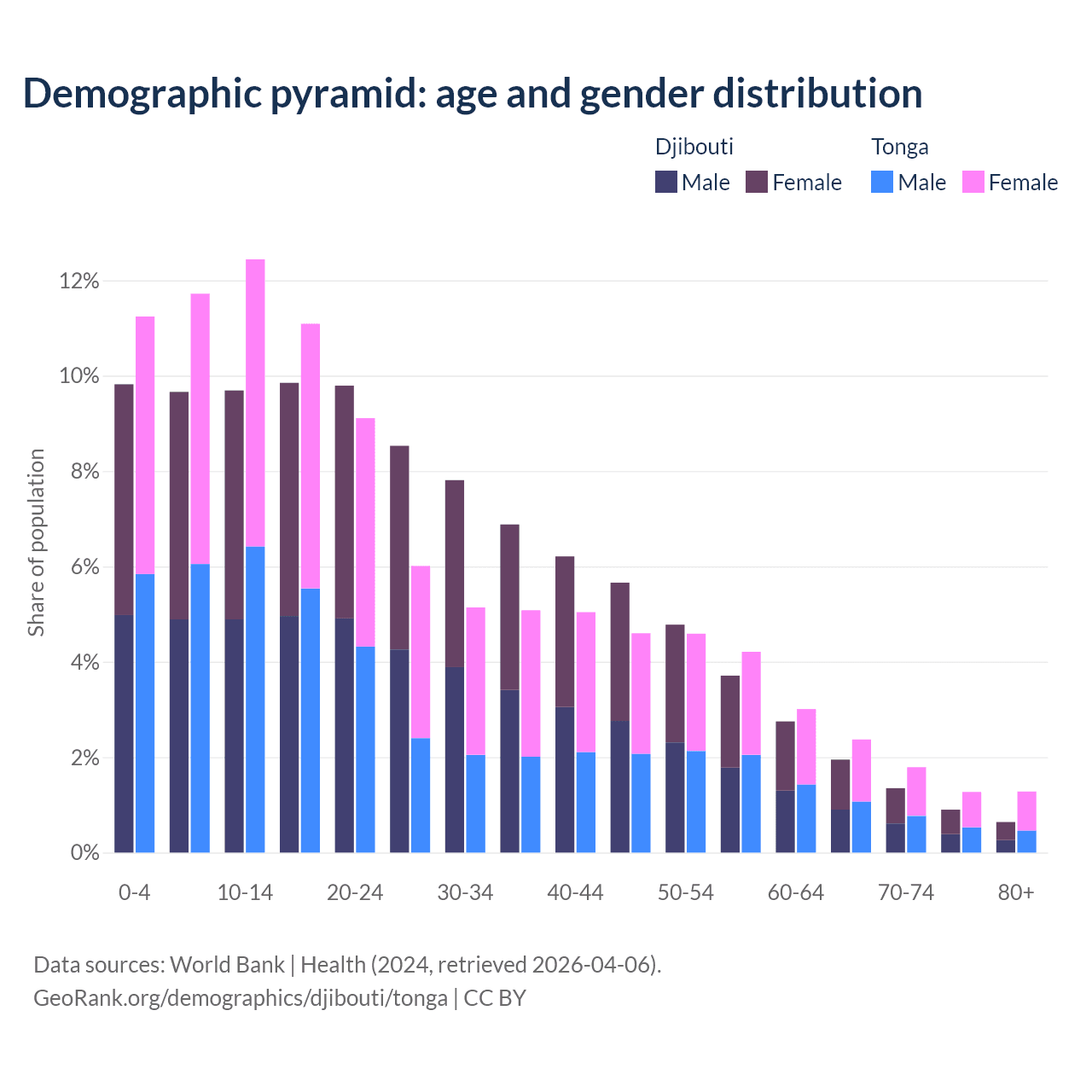 - As of 2026, the population of Djibouti is 1.2M vs 103K in Tonga - 11.7 times difference.