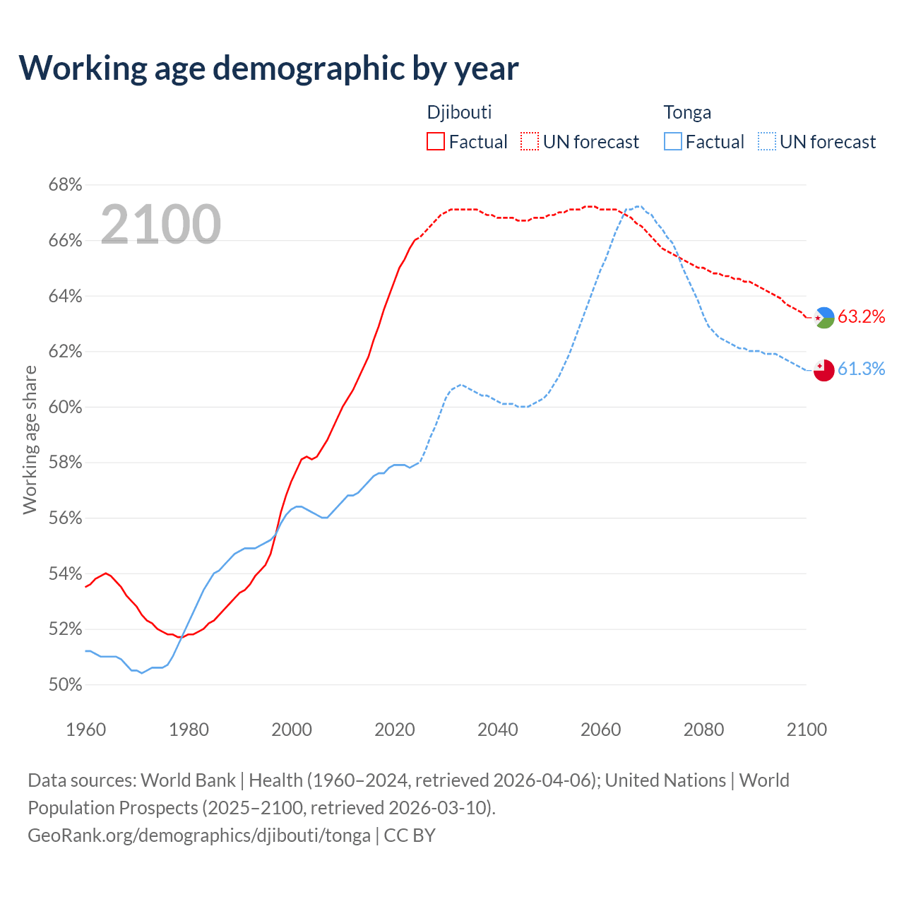 - Djibouti has 794K working age adults (aged 15-64) vs 59.8K in Tonga.