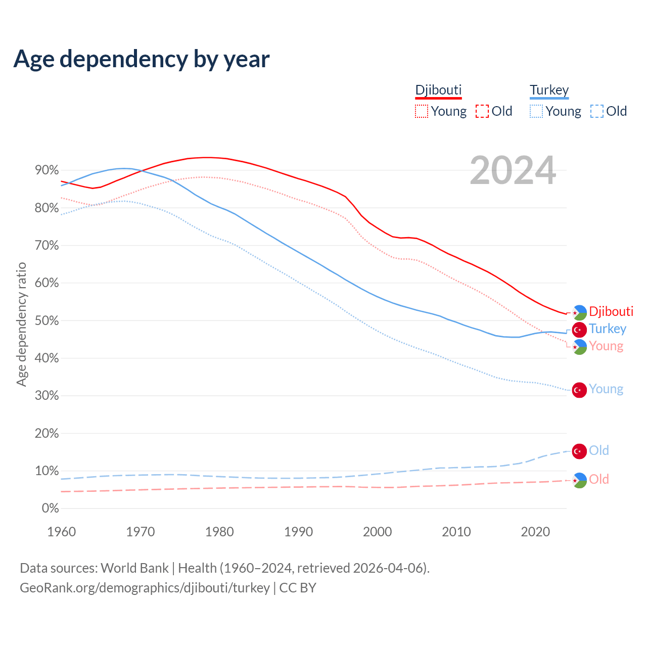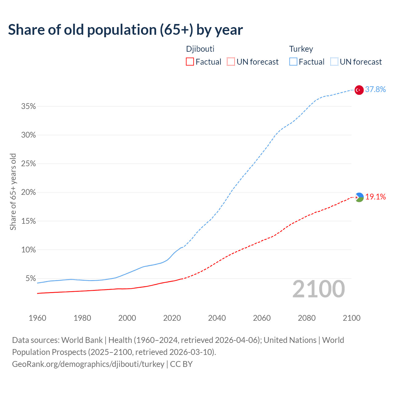 The share of older people aged 65 and over is 4.85% in Djibouti and 10.3% in Turkey. Life expectancy in Djibouti compared to Turkey .