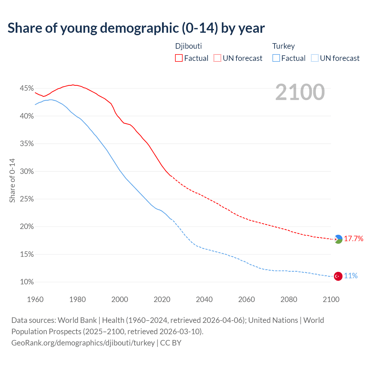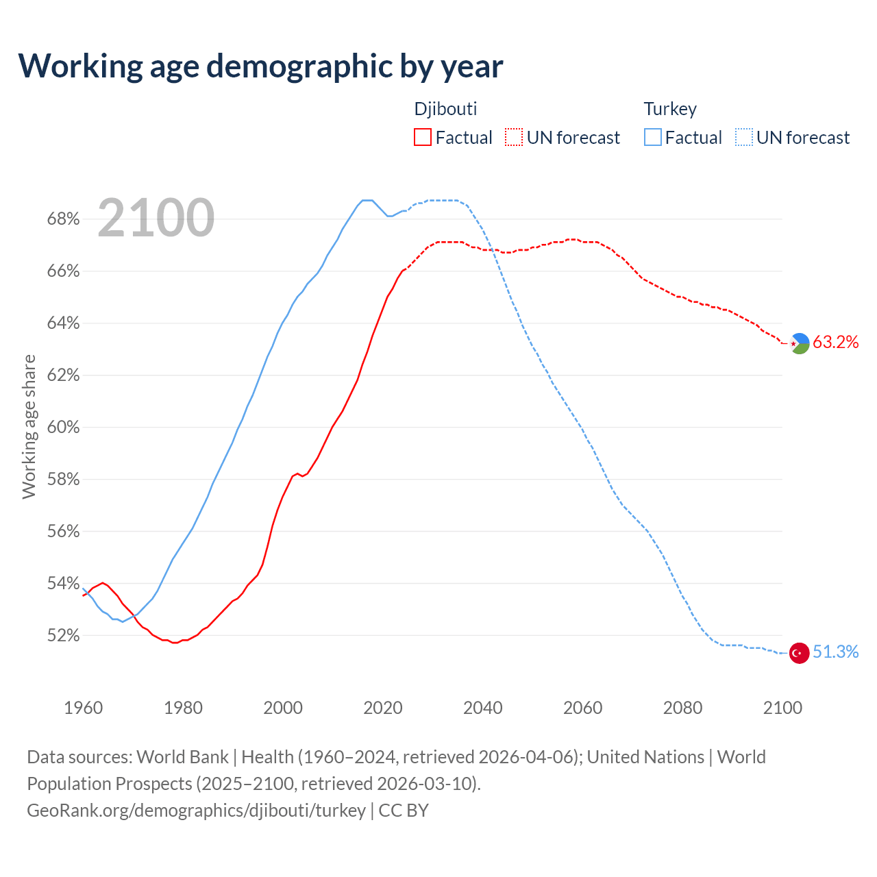 Median age Djibouti vs Turkey, 1960-2100