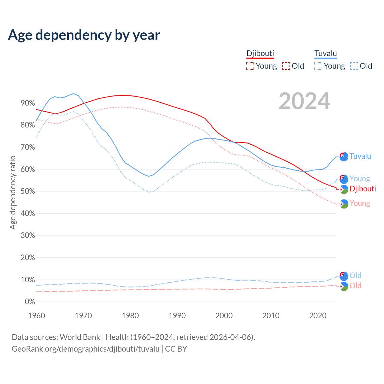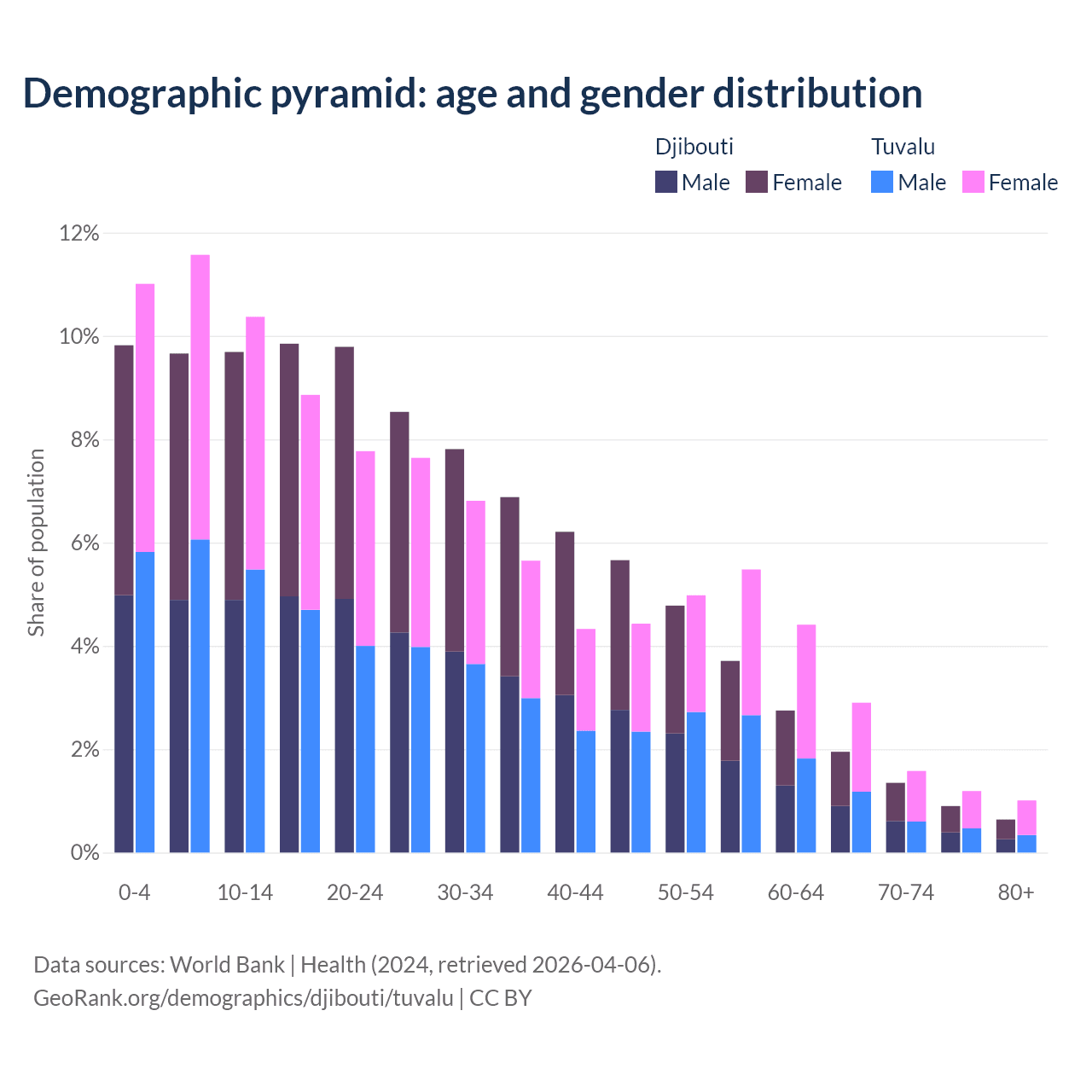 - The share of old-age demographic (65+) in Djibouti is 4.85% vs 6.67% in Tuvalu.