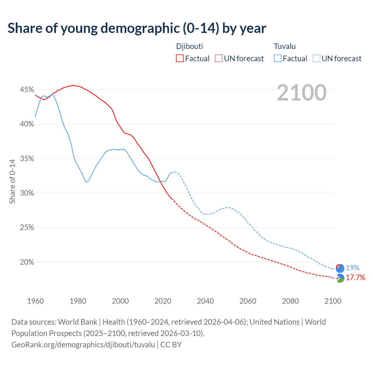 - The share of young demographic (0-15 years old) in Djibouti is 29.2% vs 32.9% in Tuvalu.