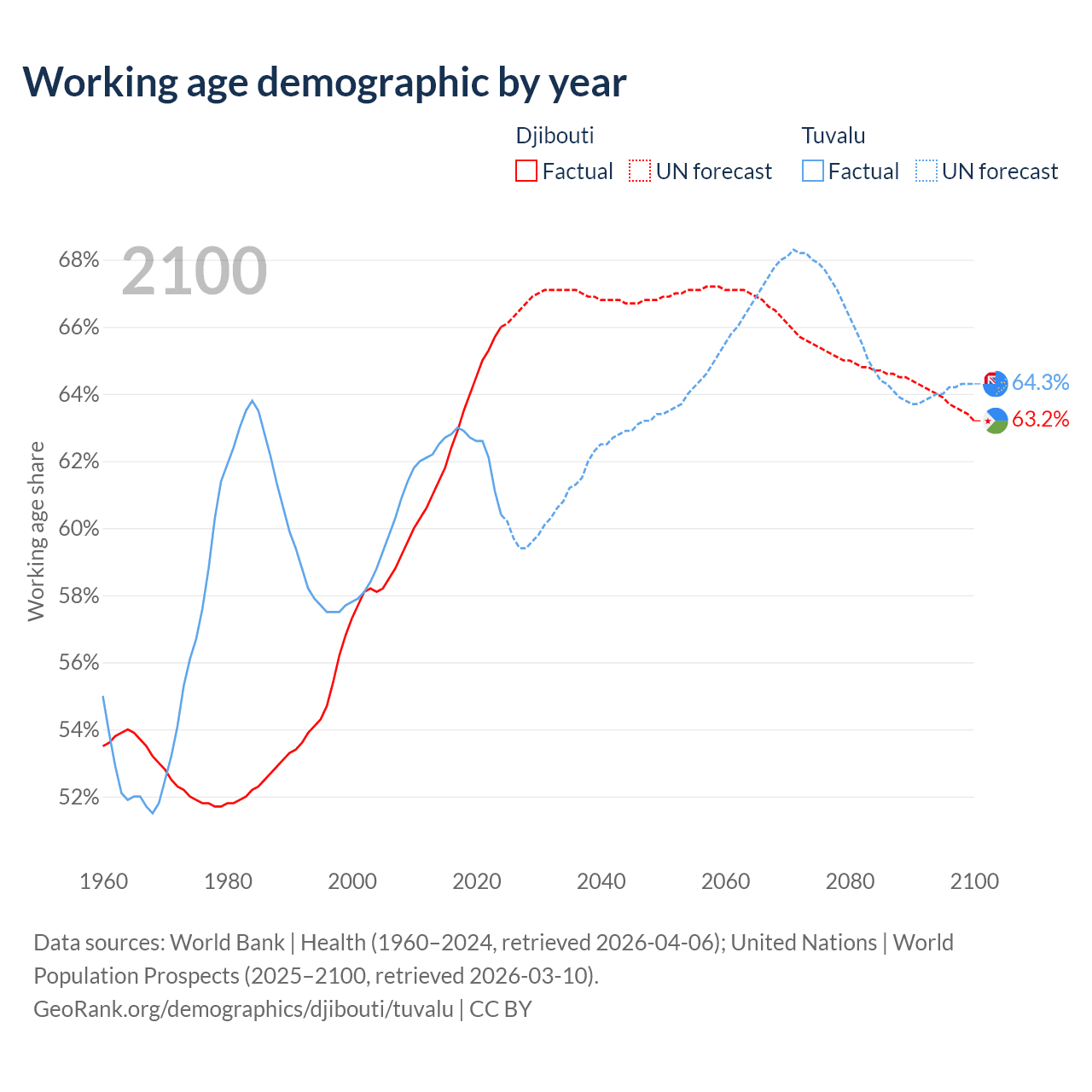 - Djibouti has 794K working age adults (aged 15-64) vs 5.64K in Tuvalu.