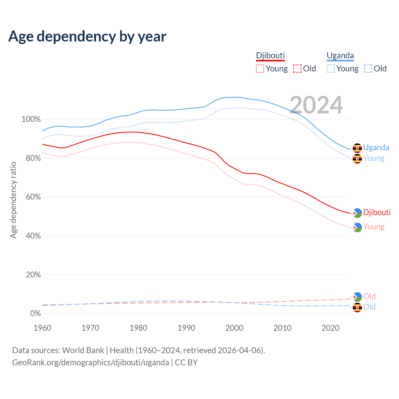 - The share of old-age demographic (65+) in Djibouti is 4.85% vs 2.19% in Uganda.