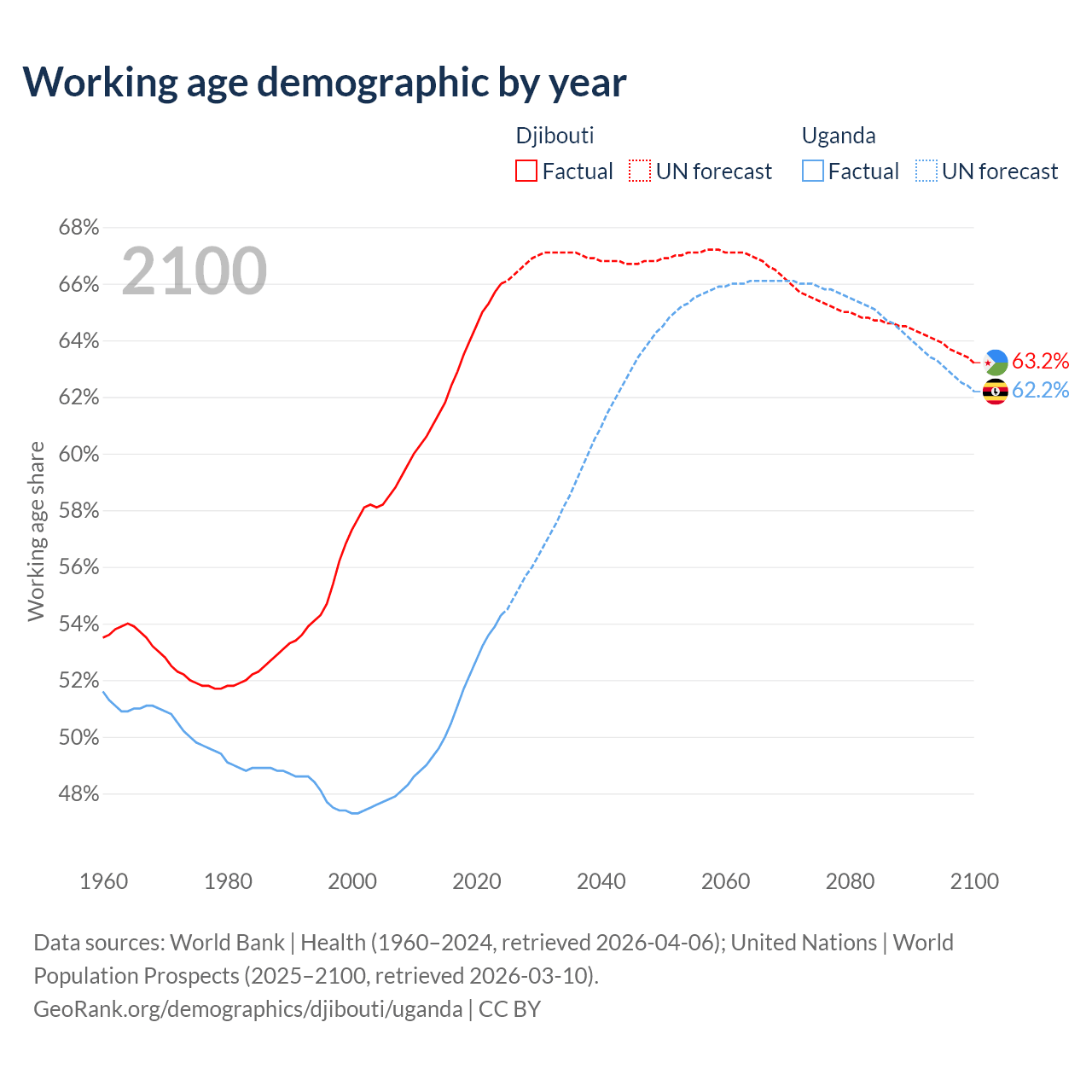 - Djibouti has 794K working age adults (aged 15-64) vs 28.9M in Uganda.