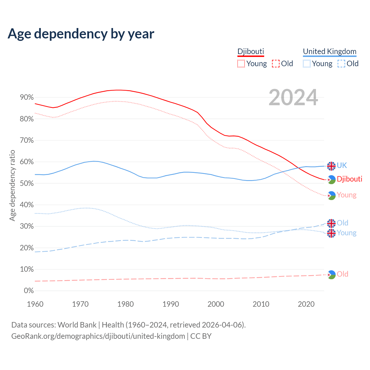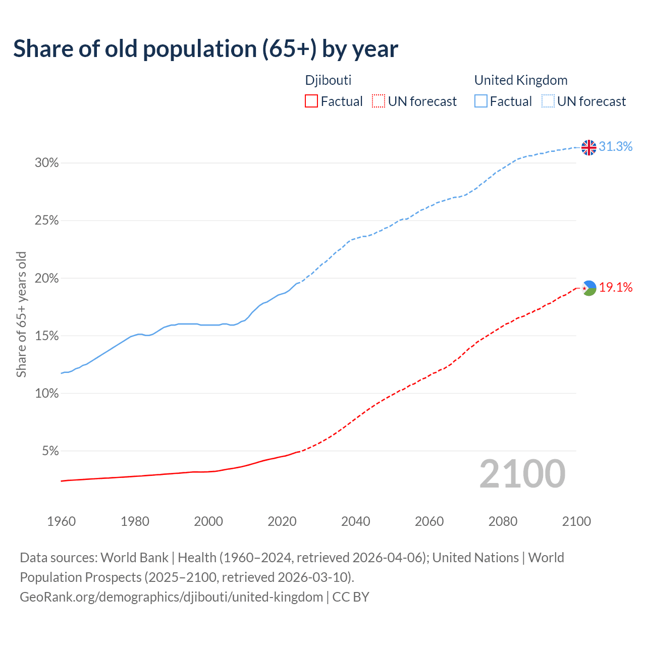 - The share of old-age demographic (65+) in Djibouti is 4.85% vs 19.5% in the United Kingdom.