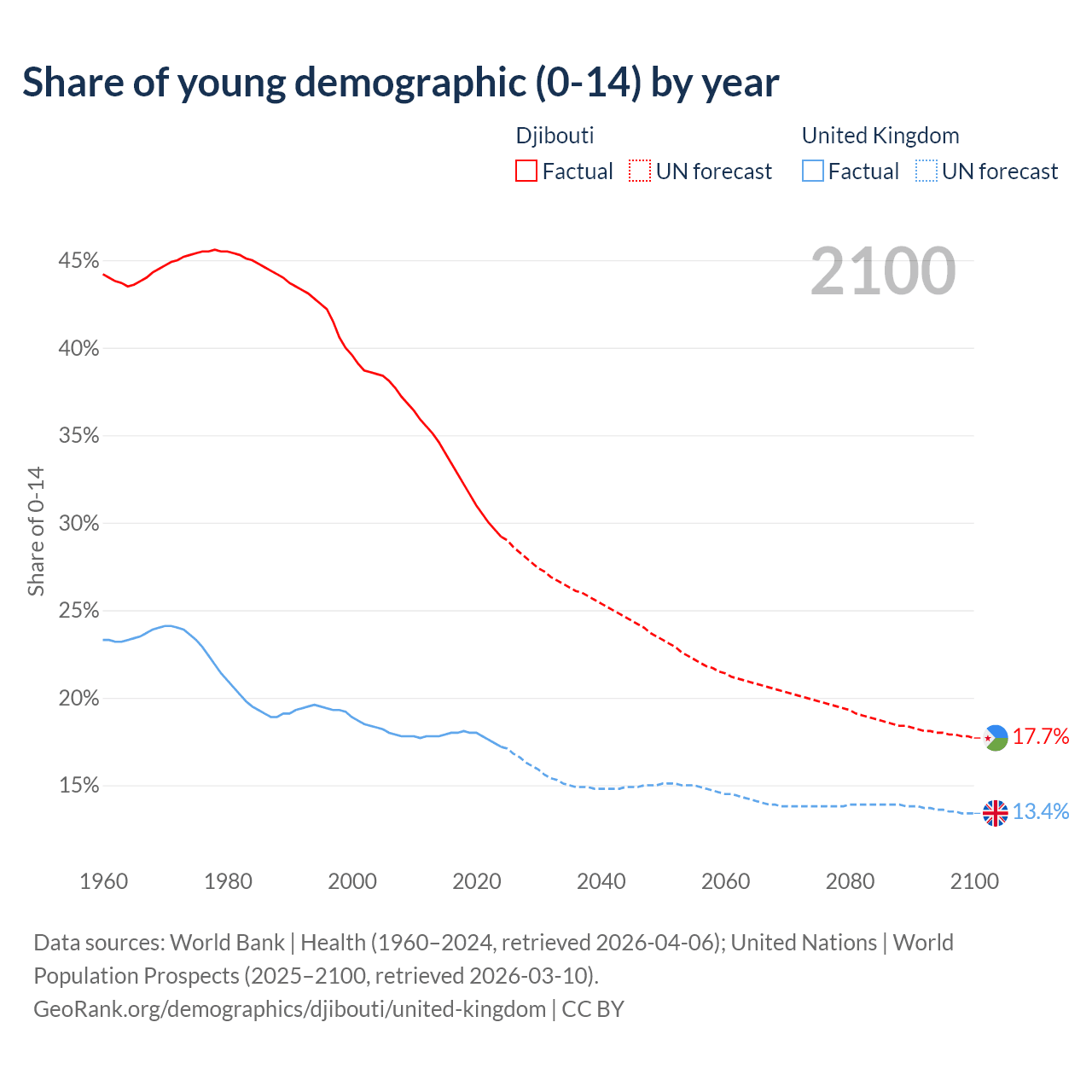 - The share of young demographic (0-15 years old) in Djibouti is 29.2% vs 17.2% in the United Kingdom.