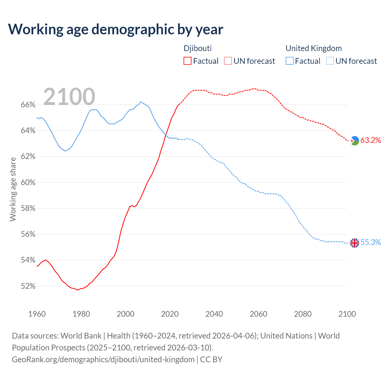 - Djibouti has 794K working age adults (aged 15-64) vs 44.4M in the United Kingdom.