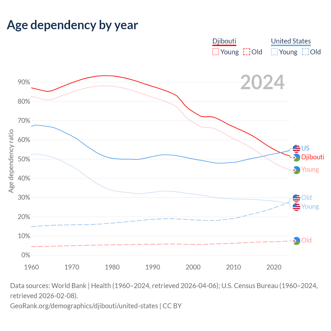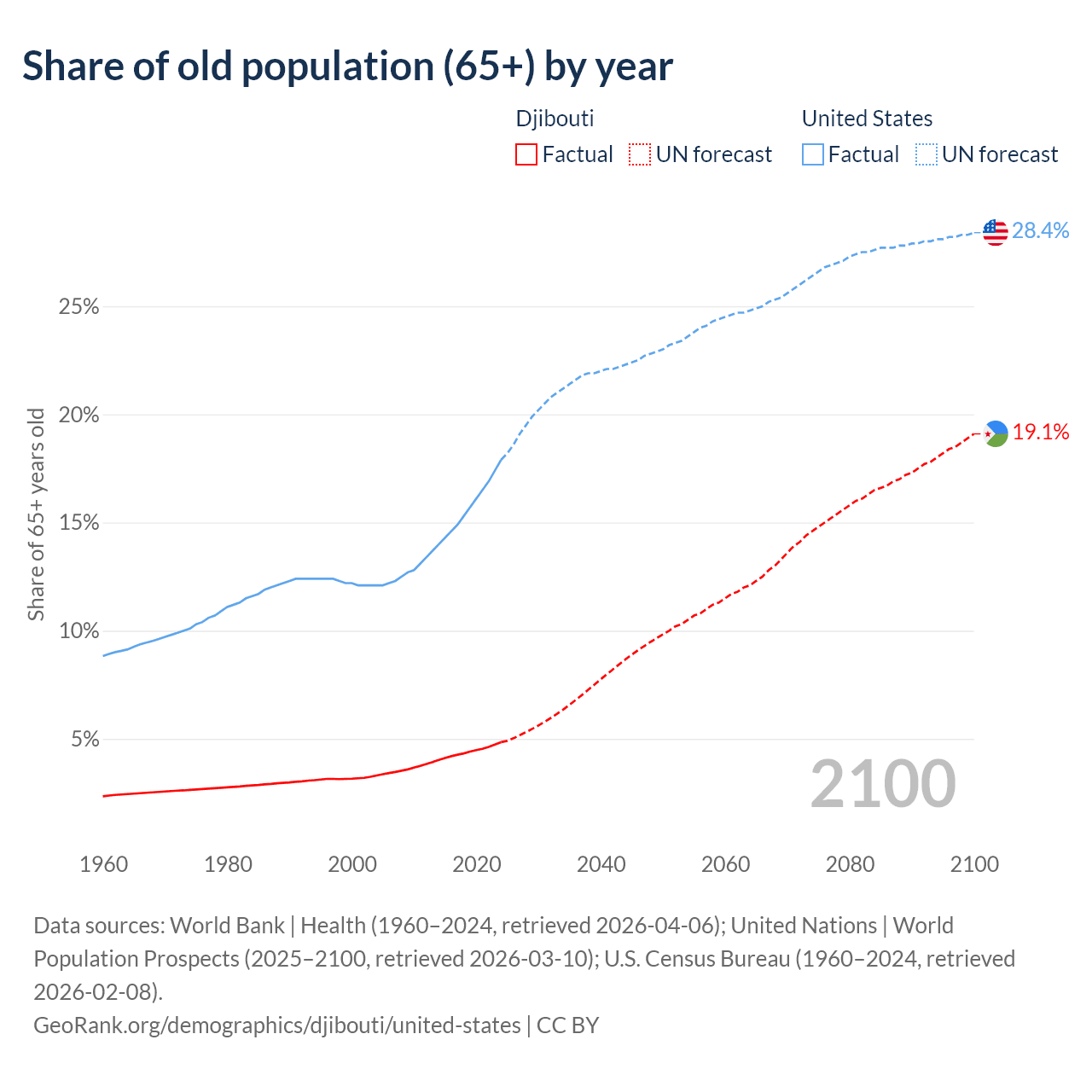 - The share of old-age demographic (65+) in Djibouti is 4.85% vs 17.9% in the United States.