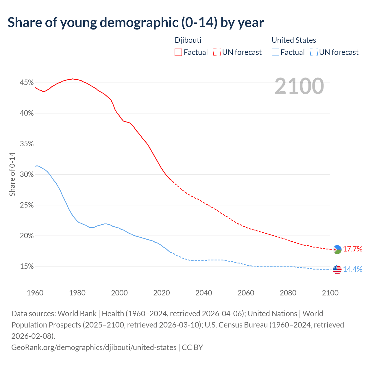 - The share of young demographic (0-15 years old) in Djibouti is 29.2% vs 17.3% in the United States.