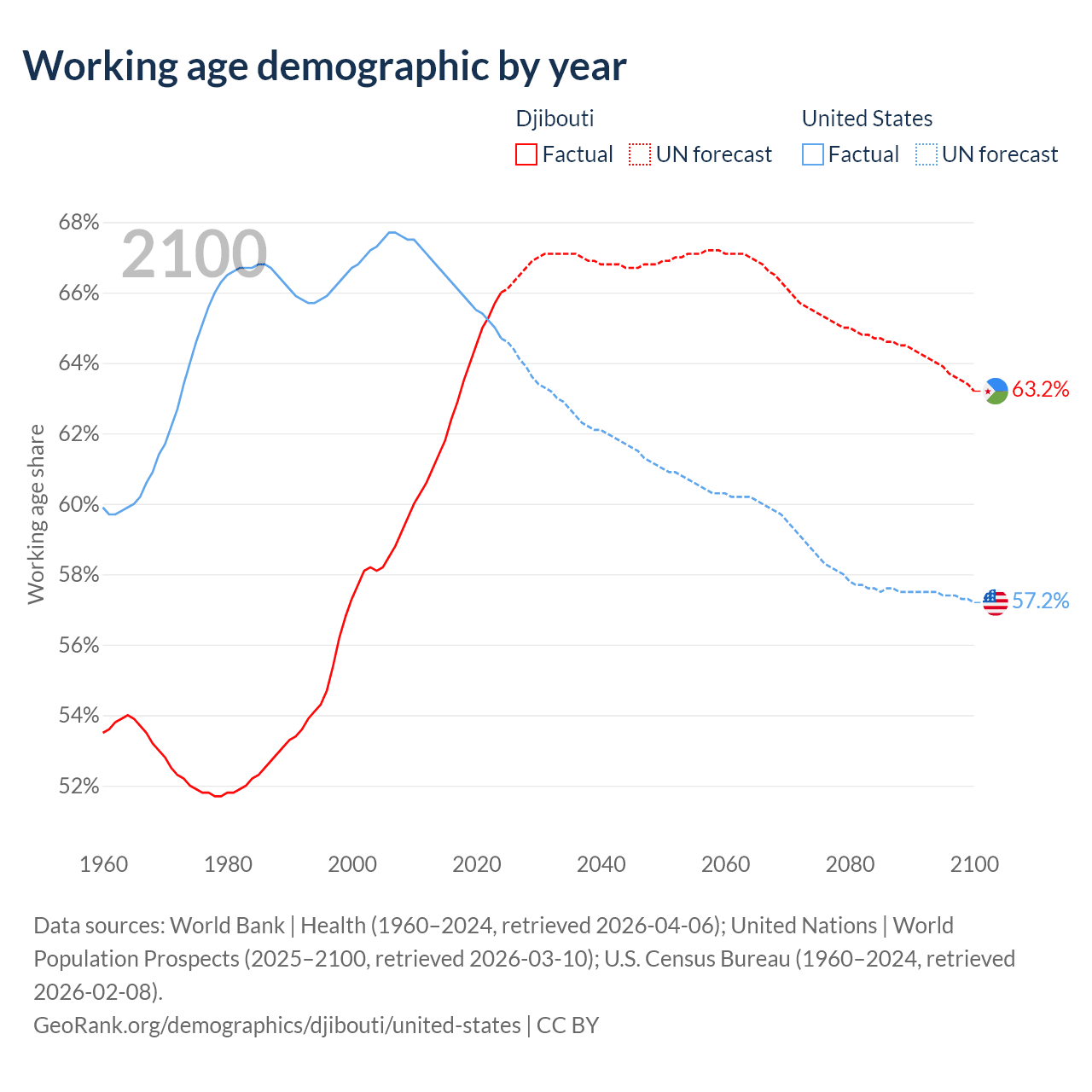 - Djibouti has 794K working age adults (aged 15-64) vs 223M in the United States.
