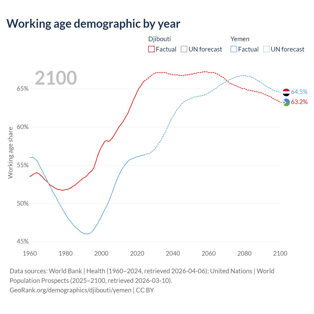 - Djibouti has 794K working age adults (aged 15-64) vs 24.4M in Yemen.