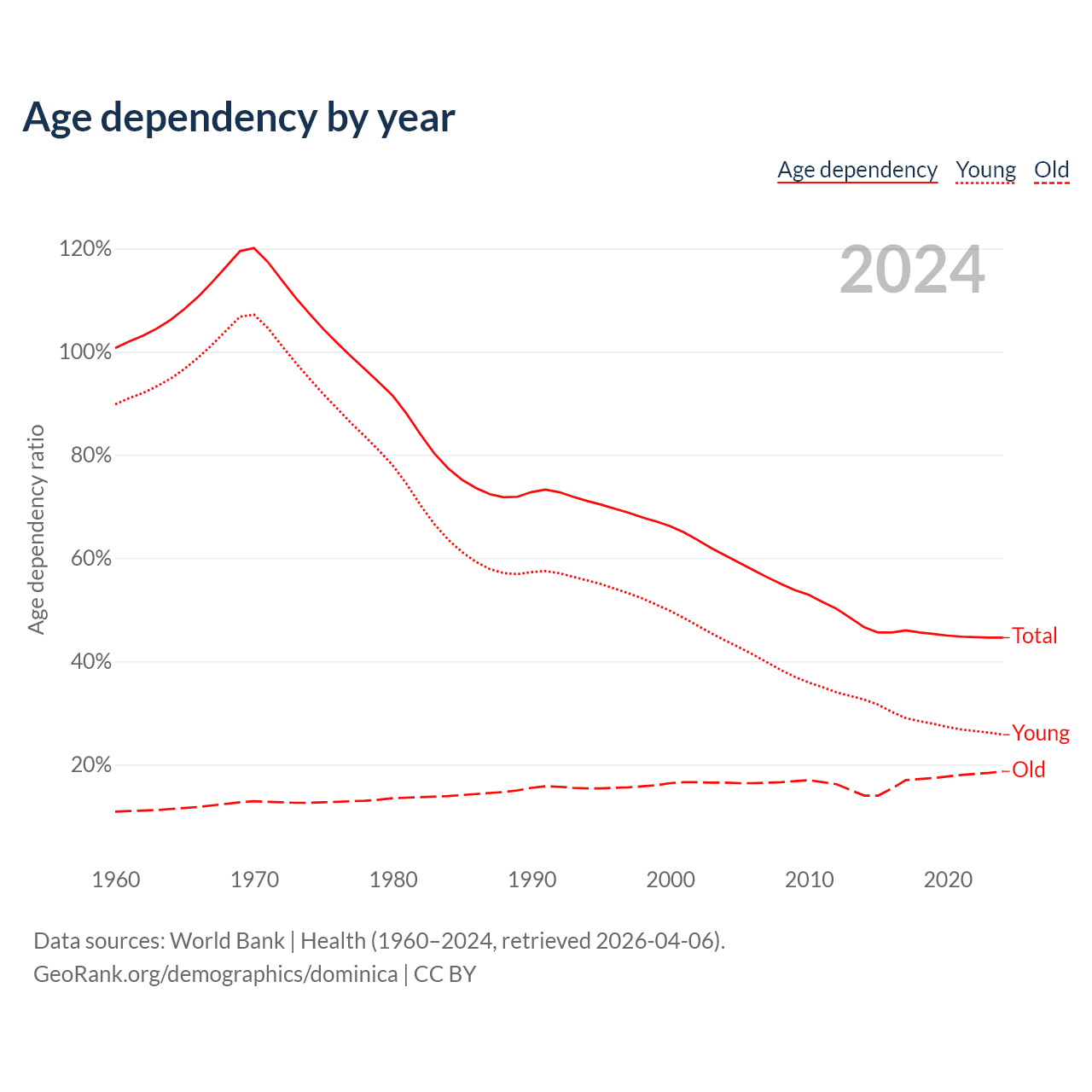 Data sources: World Bank | Health (1960–2024, retrieved 2026-04-06); U.S. Census Bureau (1960–2024, retrieved 2026-02-08).