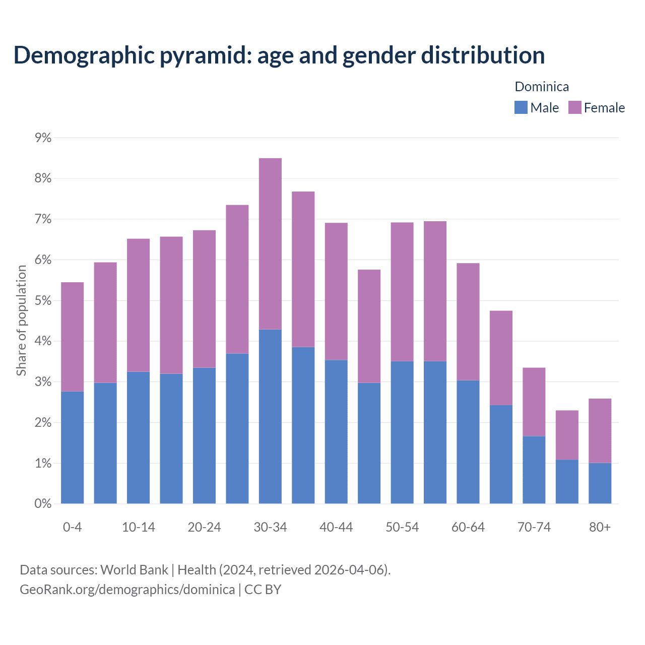 With a population of 66.2K people, Dominica has a median age of 37 years which makes it the 66/196 oldest country. 17.9% of the demographic are children 0-14 years old, 69.2% are working-age people aged 15-64, and 13% are older population aged 65+ years.