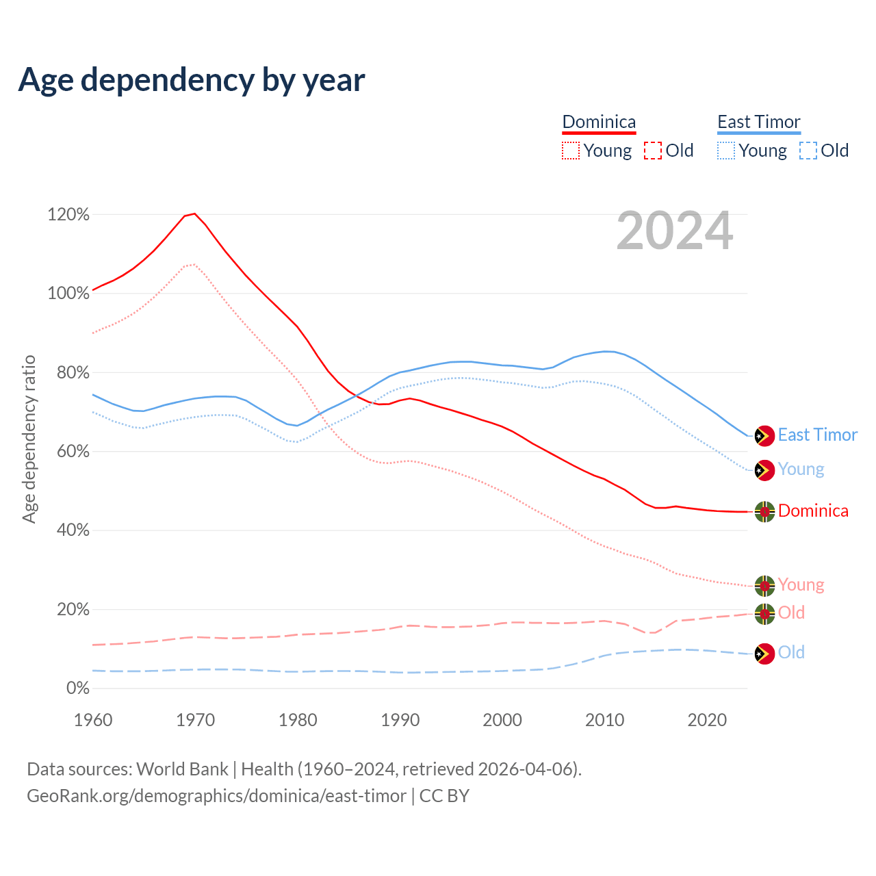 - The share of old-age demographic (65+) in Dominica is 13% vs 5.28% in East Timor.