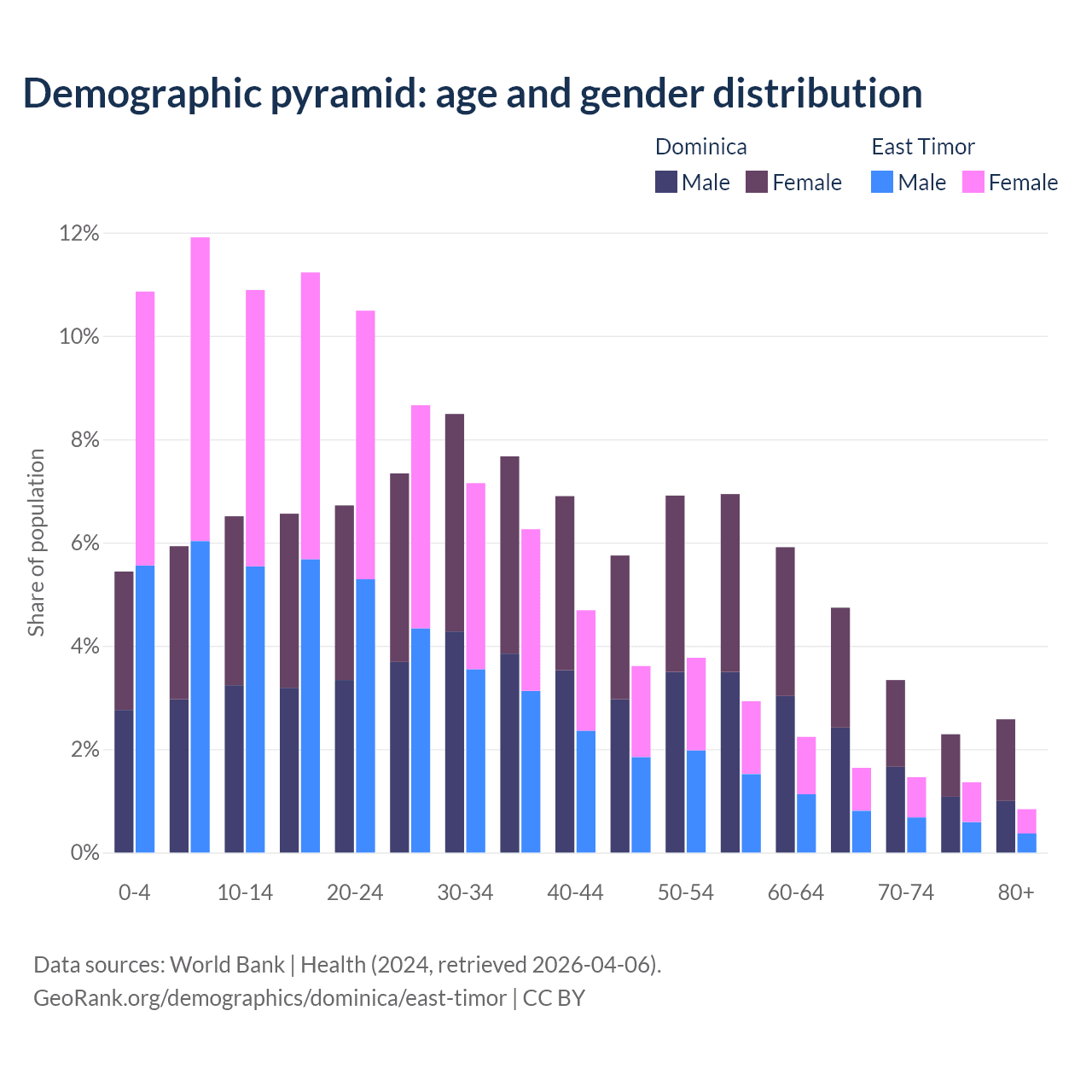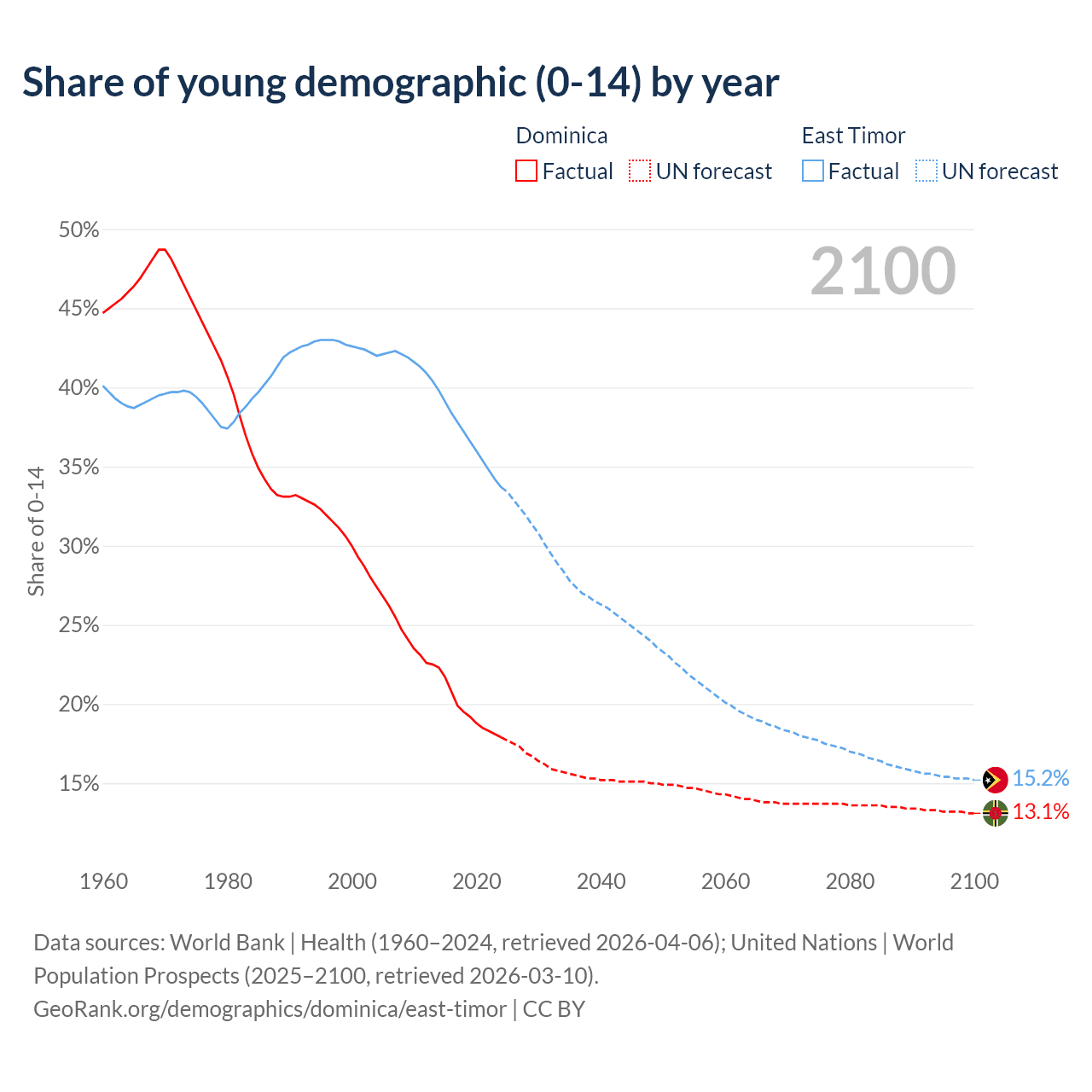 - The share of young demographic (0-15 years old) in Dominica is 17.9% vs 33.7% in East Timor.