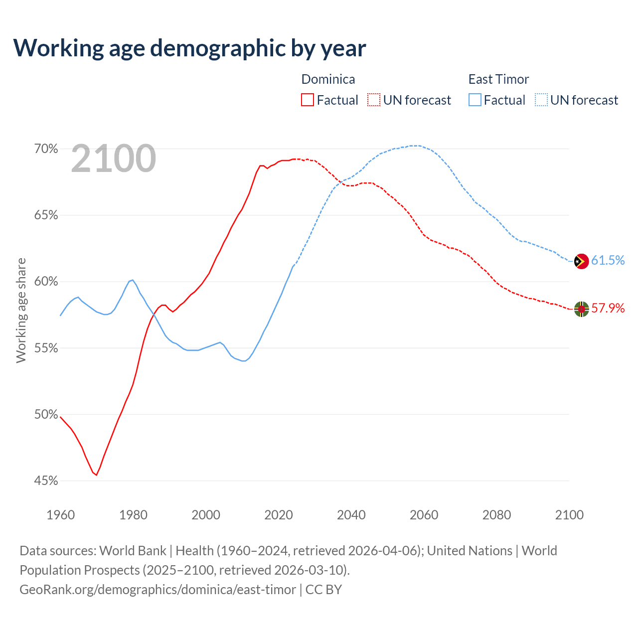 - Dominica has 45.3K working age adults (aged 15-64) vs 880K in East Timor.