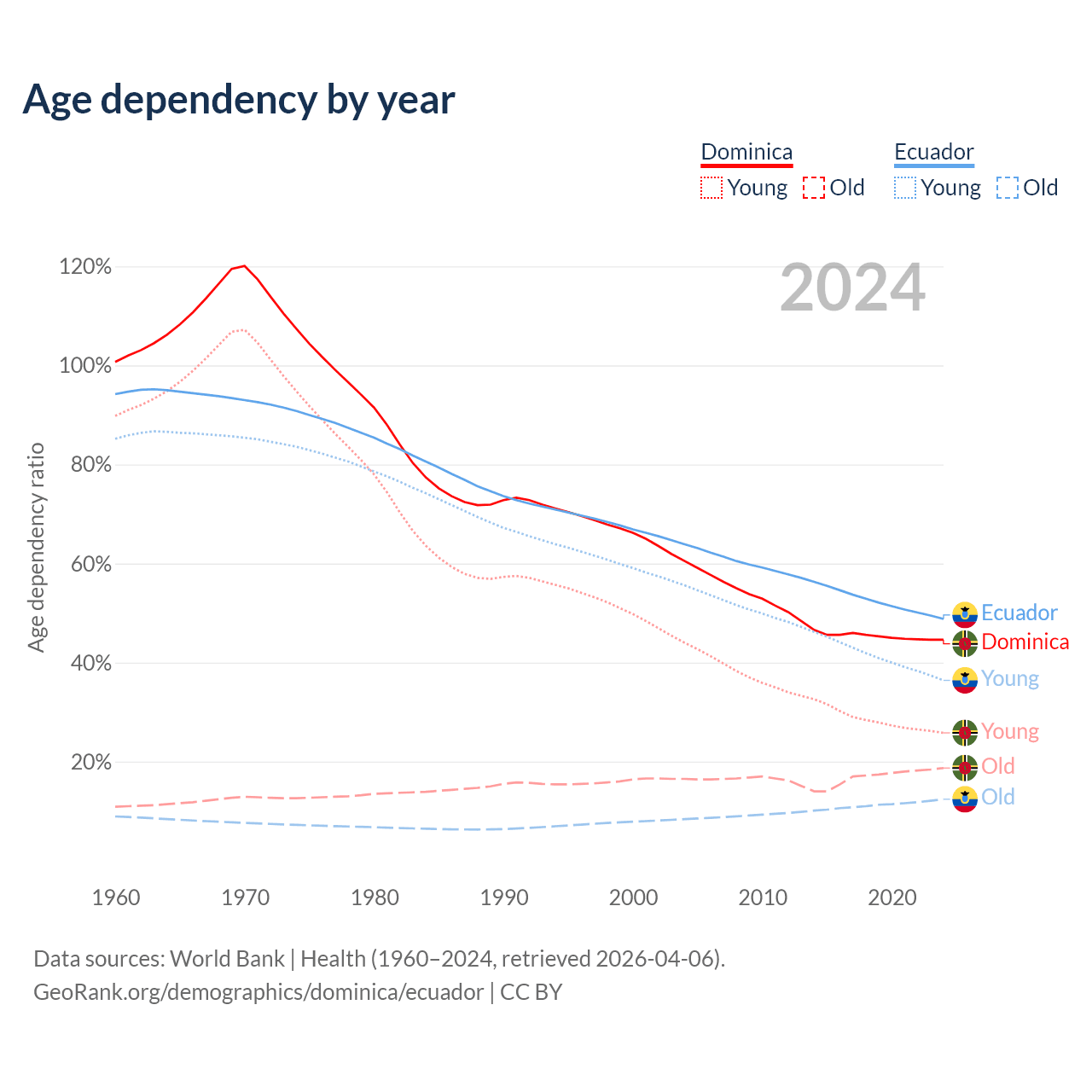 - Dominica is ranked 66/196 by median age (oldest to youngest) vs 105/196 for Ecuador.