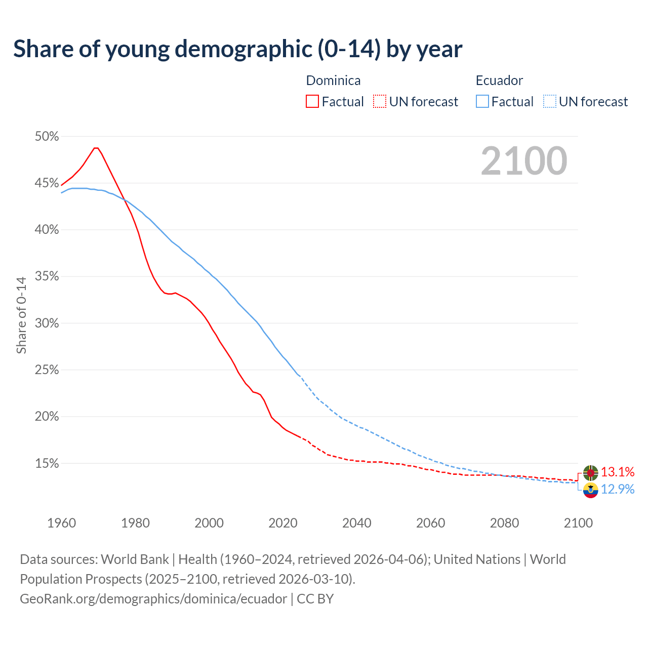 - The share of young demographic (0-15 years old) in Dominica is 17.9% vs 24.5% in Ecuador.