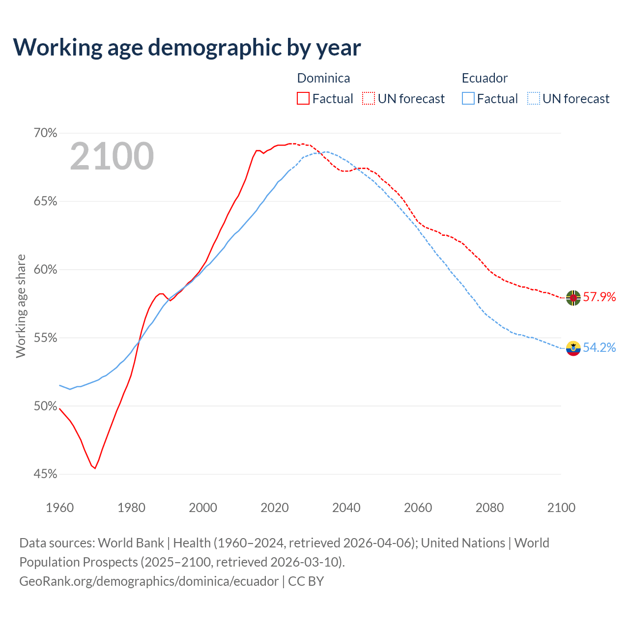 - Dominica has 45.3K working age adults (aged 15-64) vs 12.4M in Ecuador.