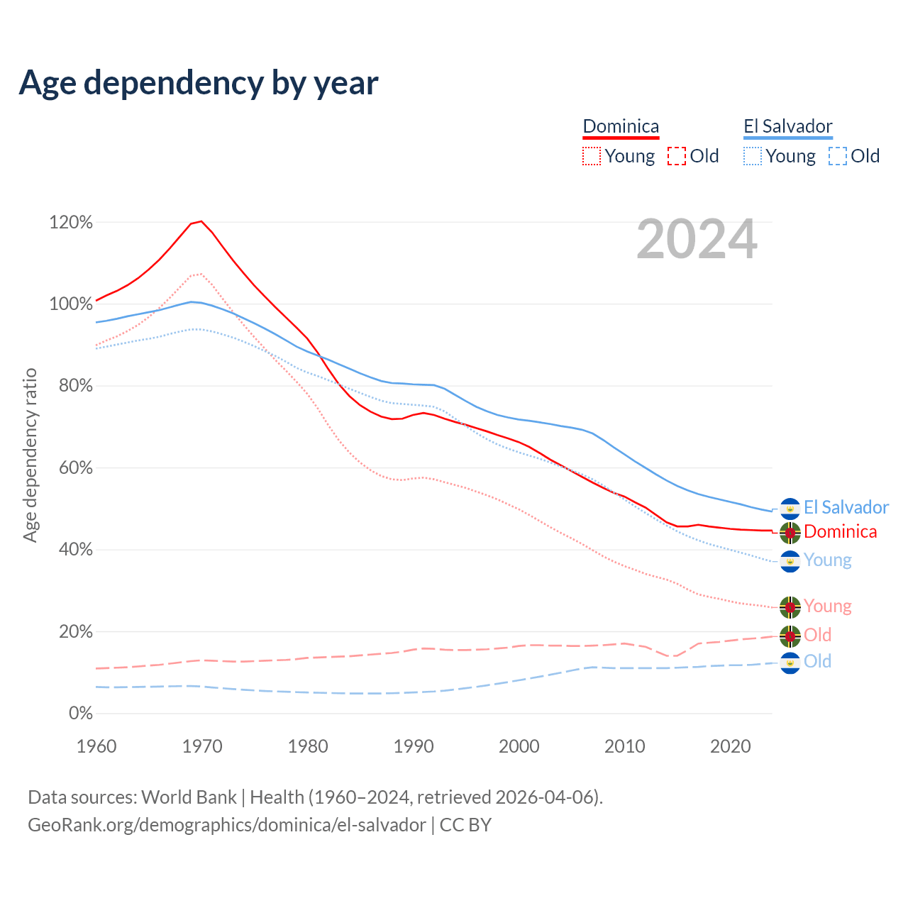 - Dominica is ranked 66/196 by median age (oldest to youngest) vs 115/196 for El Salvador.