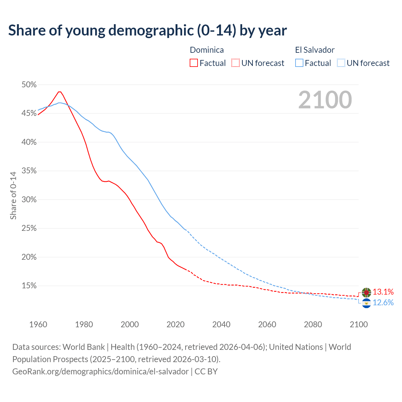 - The share of young demographic (0-15 years old) in Dominica is 17.9% vs 24.8% in El Salvador.